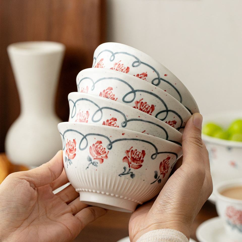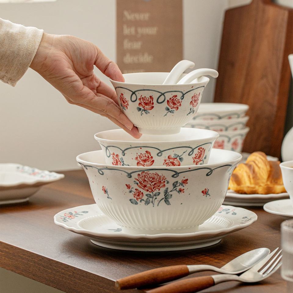 Juego de Vajilla Vintage con Relieve de Rosas Francesas, Platos de Cerámica para Pastel, Ensalada y Aperitivos, Tazones para el Hogar, Restaurante y Hotel