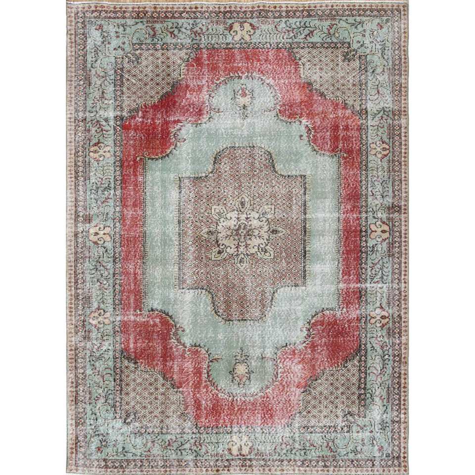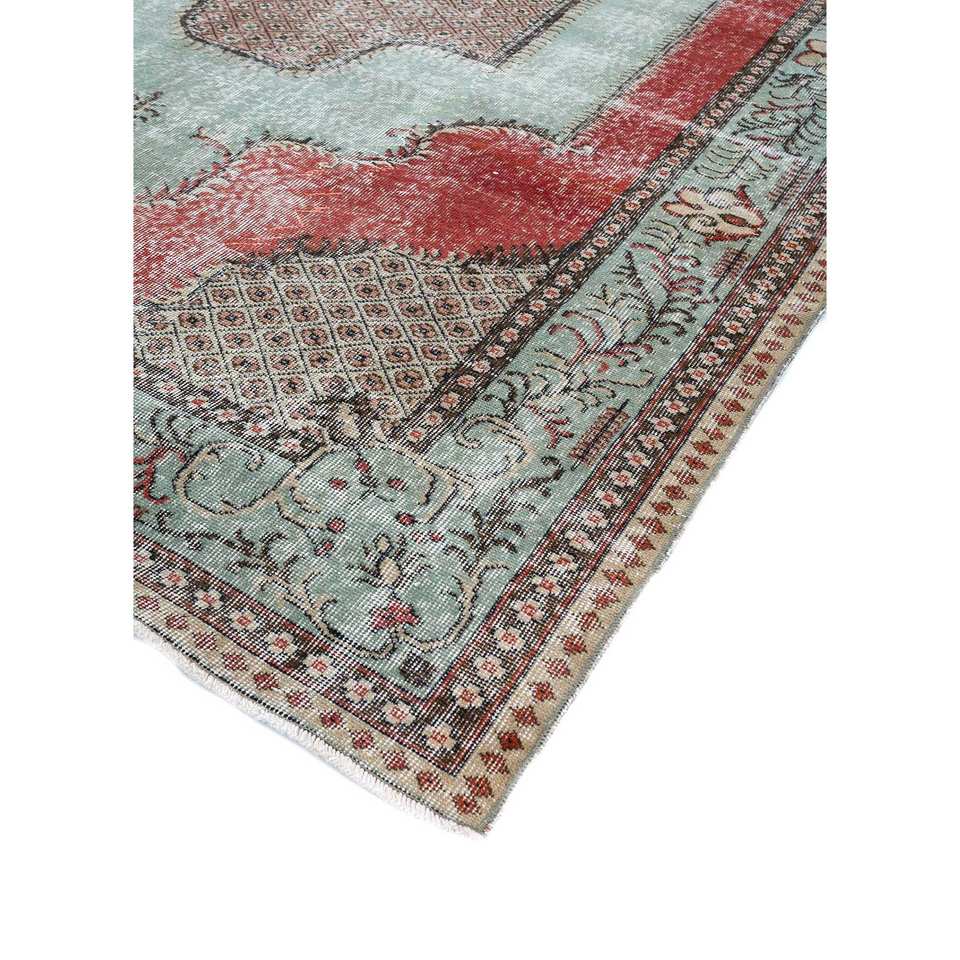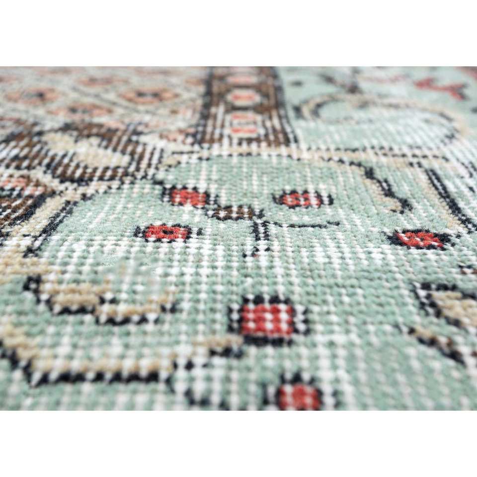 Alfombra de Lana Verde Vintage Anudada a Mano, Estilo Boho, con Medallón Abstracto y Patrón Rectangular para Entrada, Pasillo o Recibidor - Pae-2236