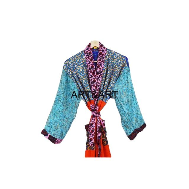 Bata Kimono de Sari de Seda India Vintage con Parches, Ropa de Dormir, Bata para Mujer, Ropa de Playa para Verano, Otoño e Invierno, 80g