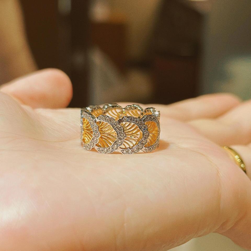 Anillo Hueco de Oro Tallado con Patrón Tejido de Lujo Ligero Vintage, Plata S925 Chapada en Oro, Estilo Tela, Diseño de Encaje, Incrustaciones Finas