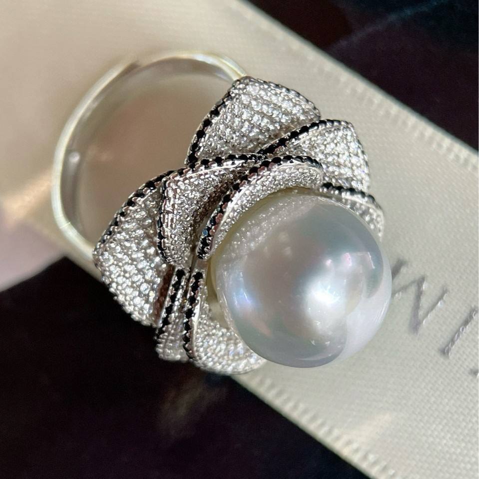 Anillo de Diamantes de Lujo Vintage con Perla Natural de Agua Dulce con Fuerte Luz Blanca, Joyería de Lujo Redonda Camelia - Venta al por Mayor
