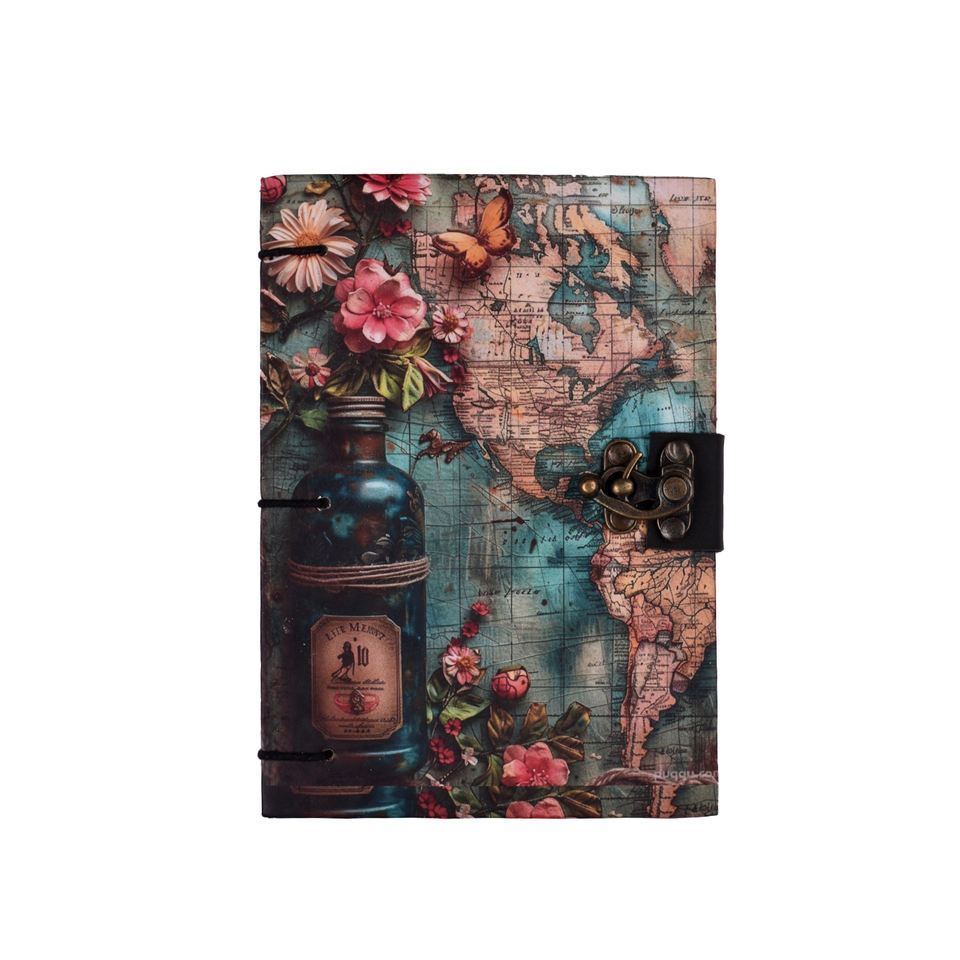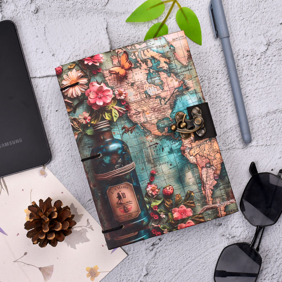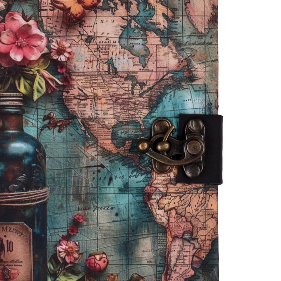 Diario Hecho a Mano con Mapa Vintage y Candado | Cuaderno A5 con Diseño Floral y Temática de Viajes | Diario de Estilo Antiguo para Escribir y Regalar