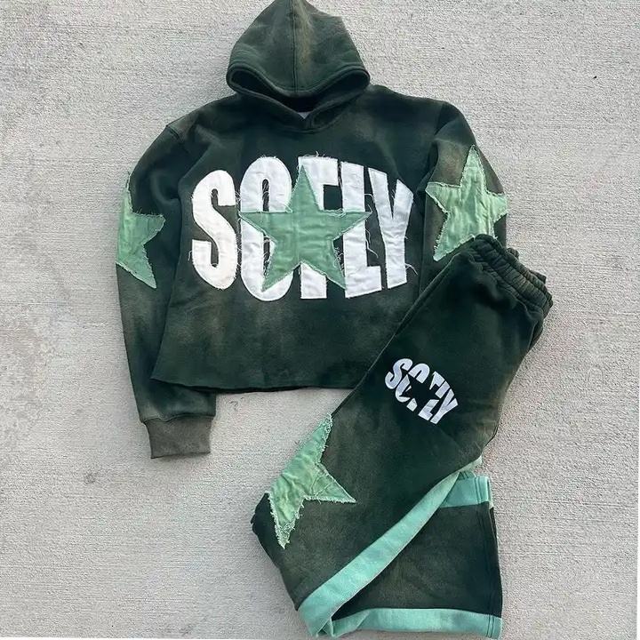 Chándal Vintage con Parche Desgastado para Hombre, Conjunto de Chándal con Capucha y Llamarada, Ropa de Calle, Lavado con Ácido, Sun Fade