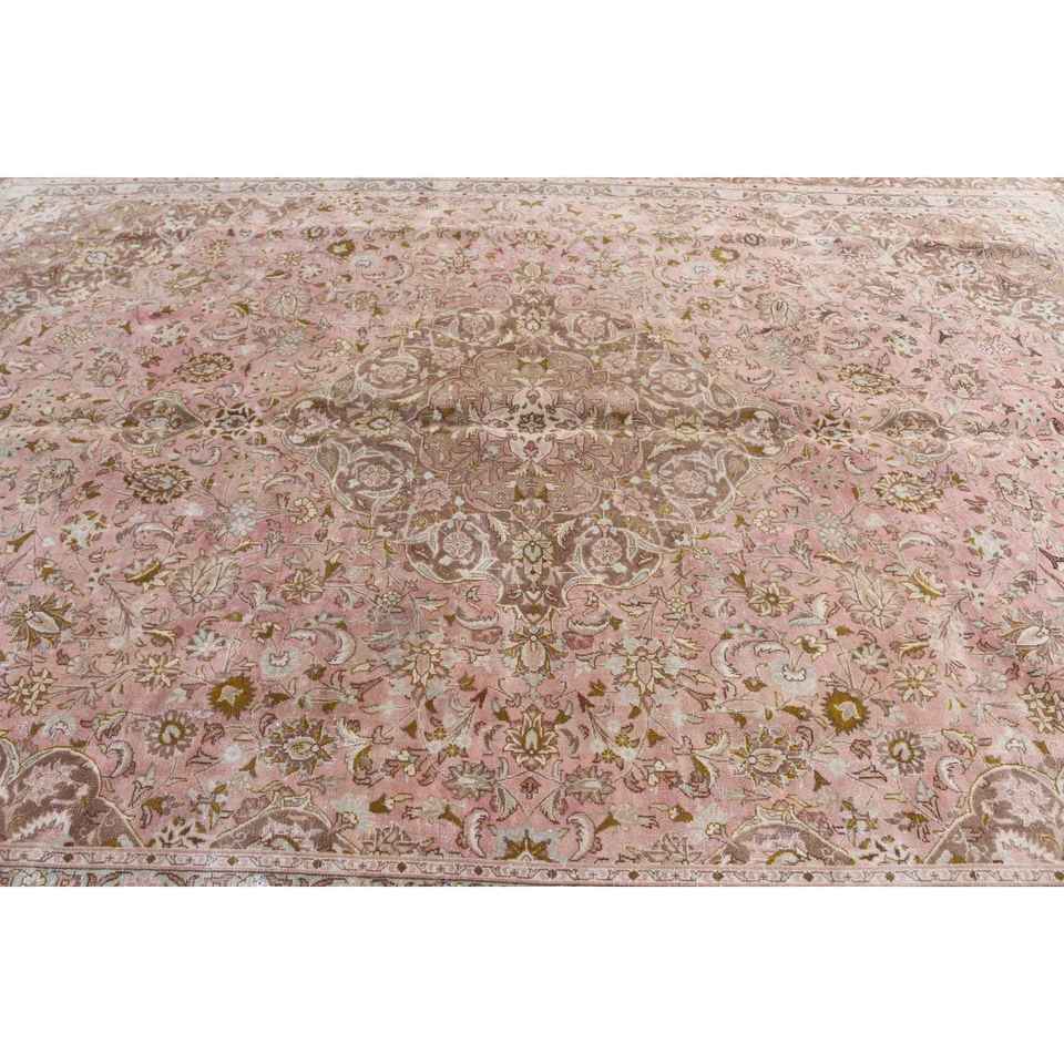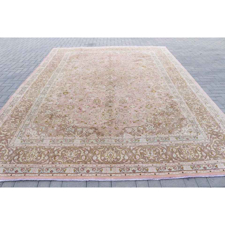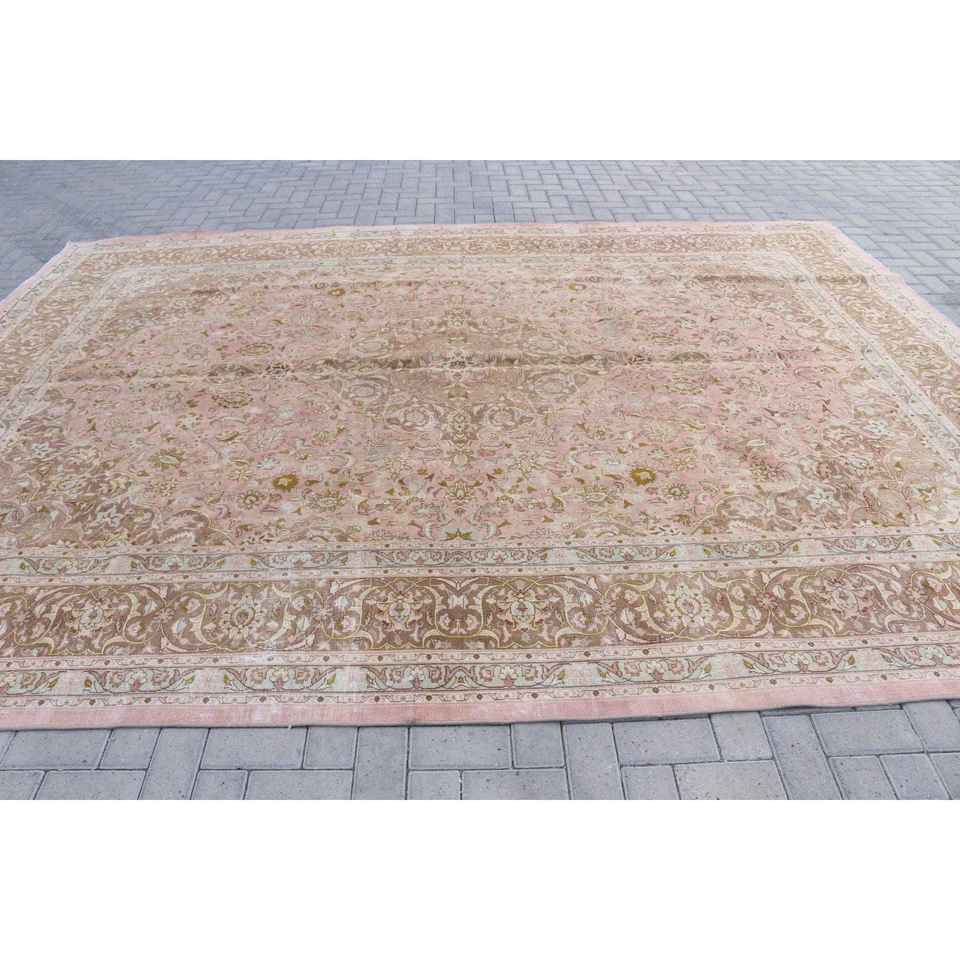 Alfombra Vintage Extra Grande Ecológica con Base de Látex, 9.5x12.8 pies, Rosa Marrón, Diseño de Patchwork, para Comedor, de Lana