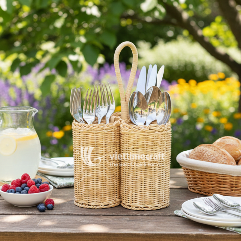 Cesta de Picnic Rectangular Vintage de Ratán con Compartimentos, Organizador de Mesa Multifuncional y Sostenible para Exteriores