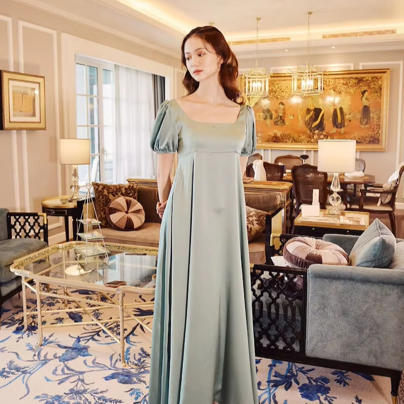Vestido Largo de Seda Estilo Regencia Vintage, Vestido Maxi Ecológico para Eventos Temáticos de Bridgerton, Otoño, Graduación, Natural