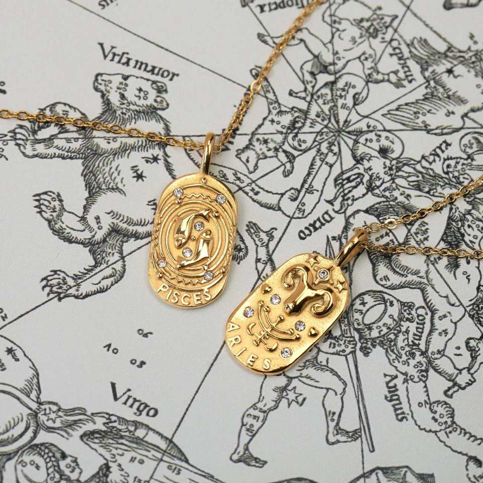 Vintage Relievo grabado doce signos del zodiaco circón colgante collar 18K chapado en oro collar de acero inoxidable fiestas parejas