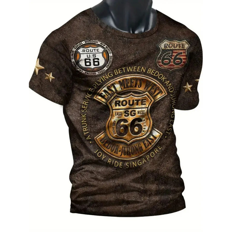 Camiseta Vintage de Sublimación con Patrón de Ruta 66 para Hombre, Camiseta Ligera de Manga Corta con Cuello Redondo, Informal