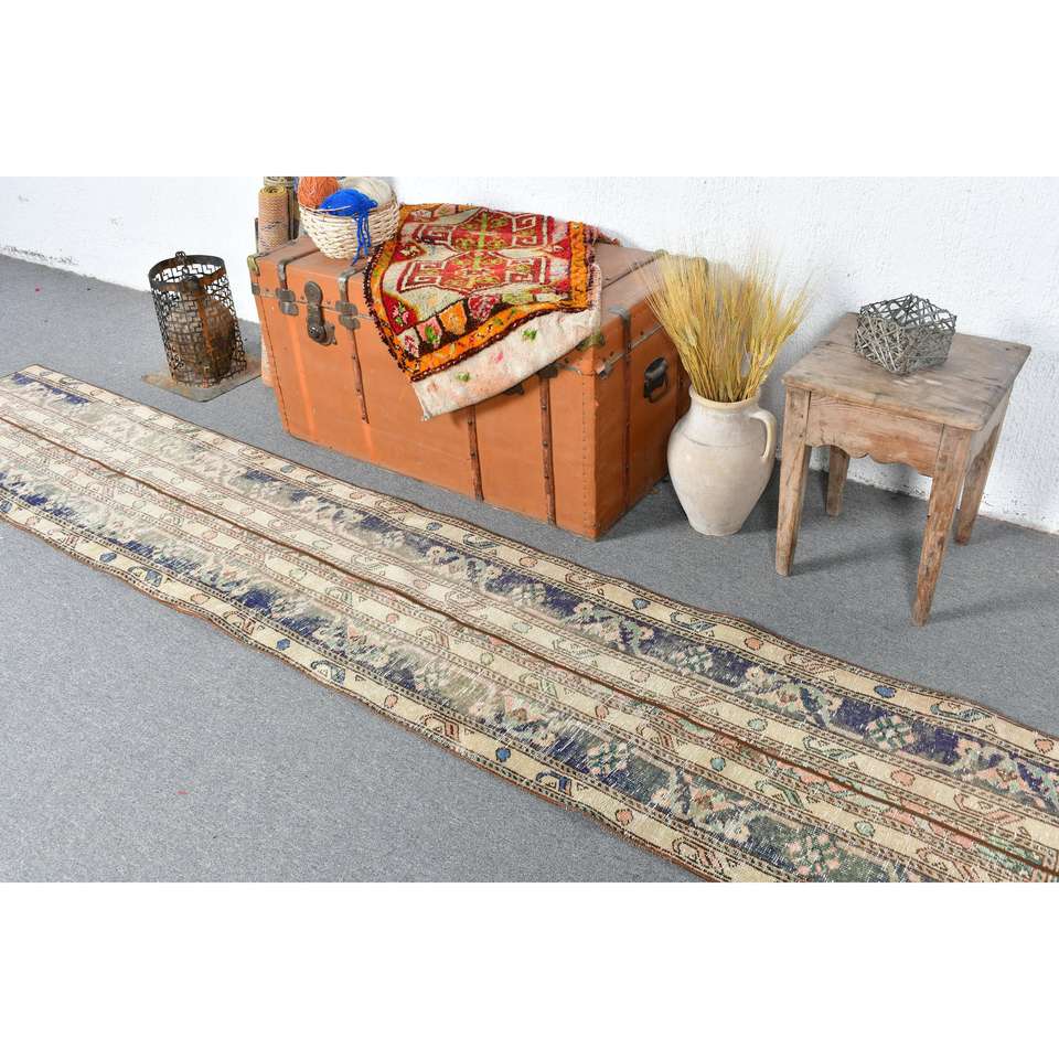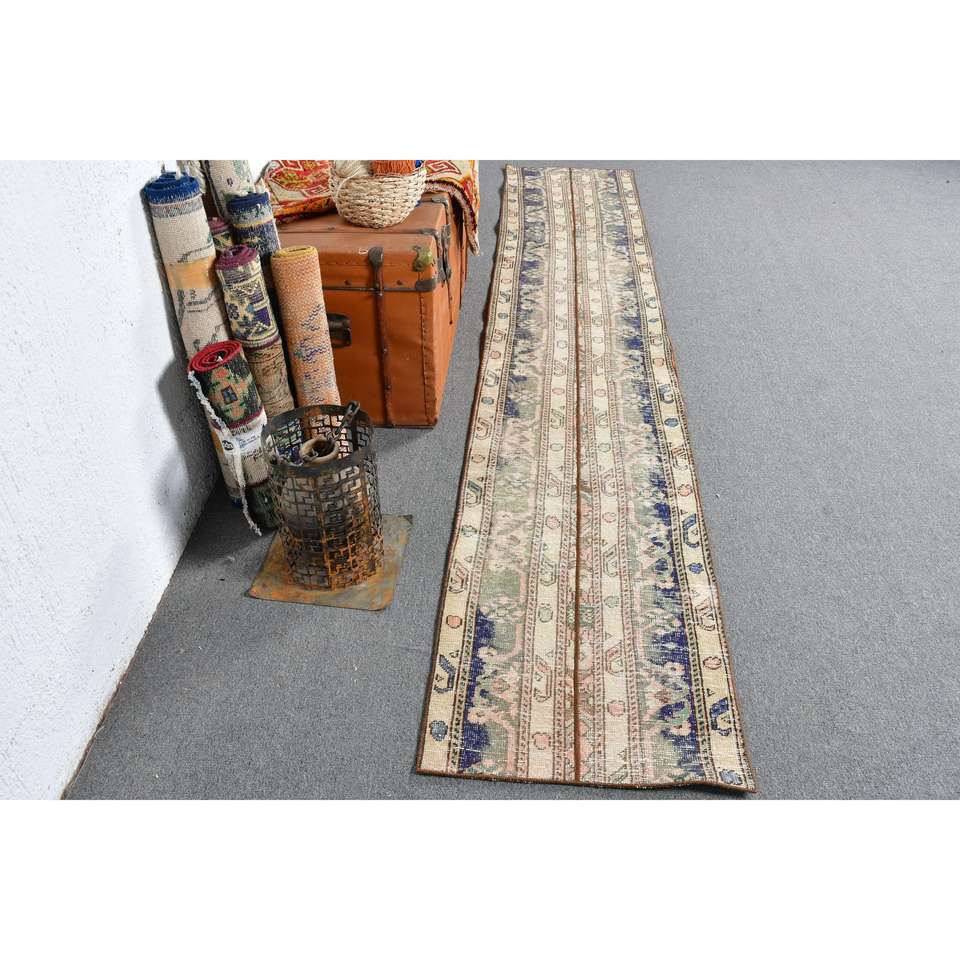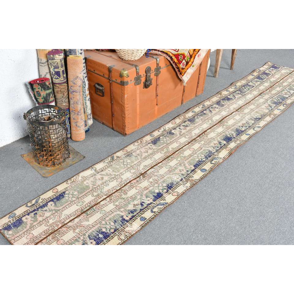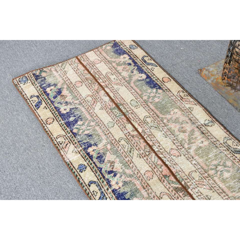 Alfombra Vintage, Alfombra Turca de 1.9x10.2 pies, Alfombra de Lana con Estampado Animal Azul