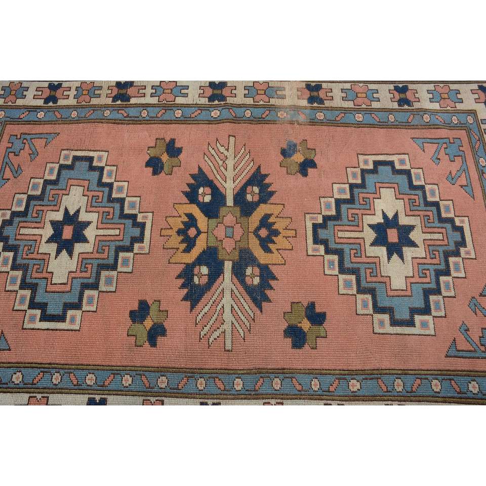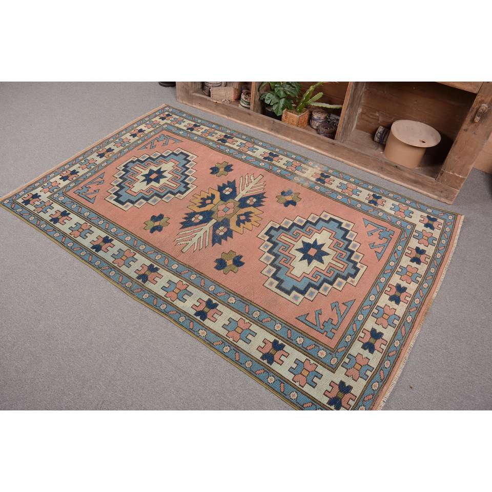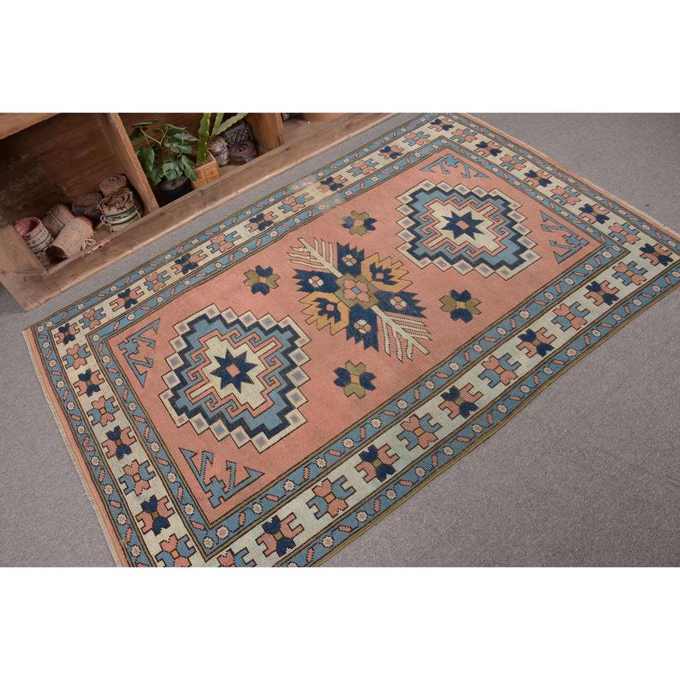 Alfombra Vintage de 4.2x6.3 pies, Alfombra Turca de Lana con Bordes Azules y Rojos