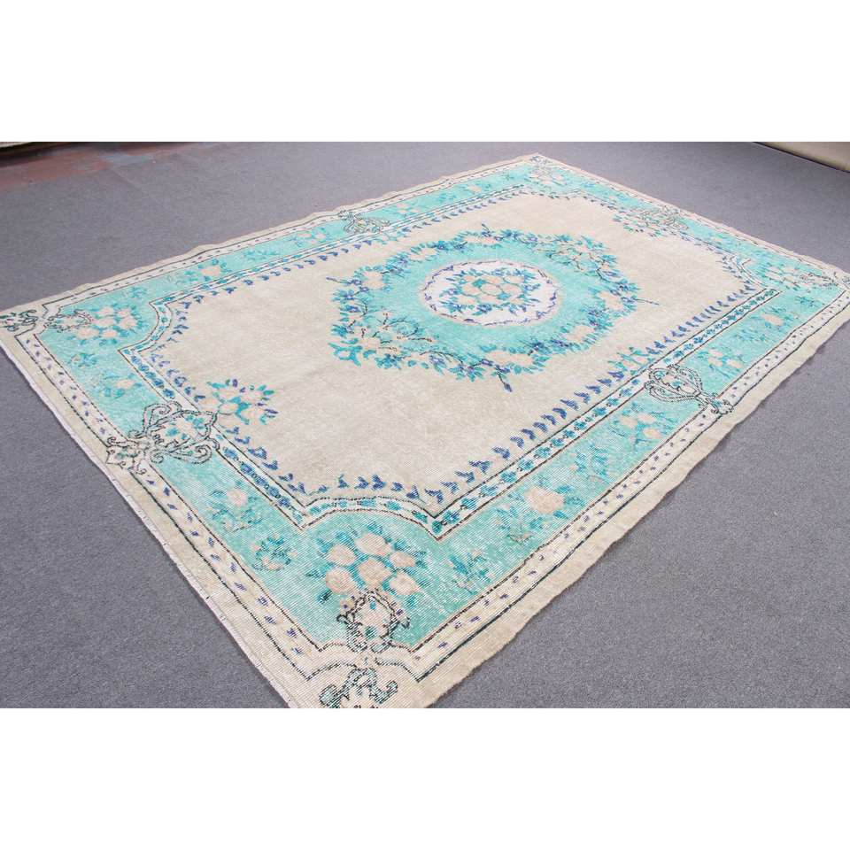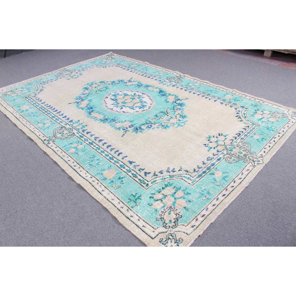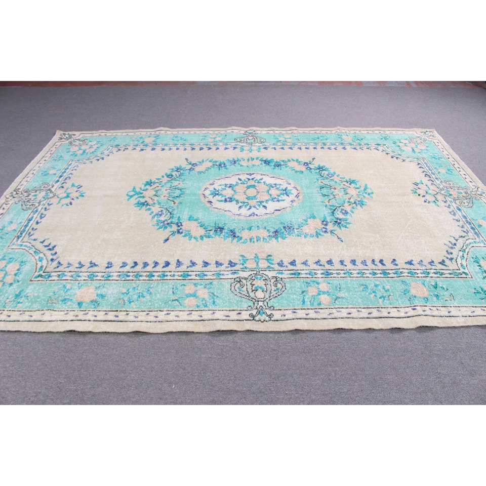 Alfombra Vintage, Alfombra Turca de 6.5x9.9 pies, Alfombra de Lana Azul y Blanca Estilo Suroeste