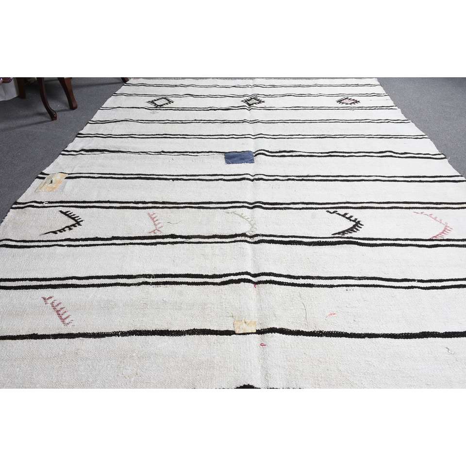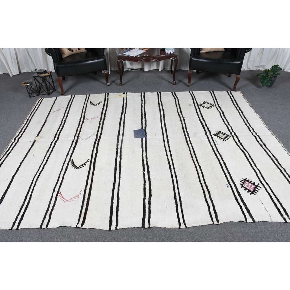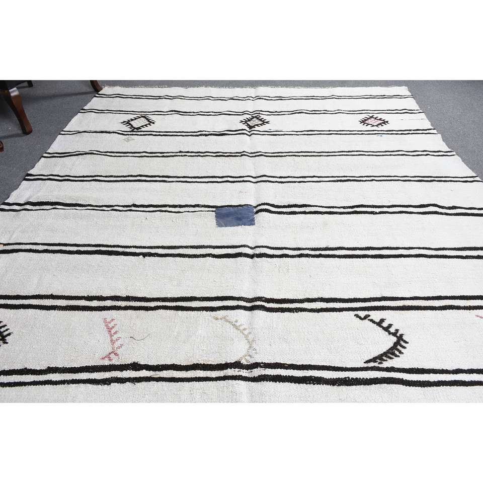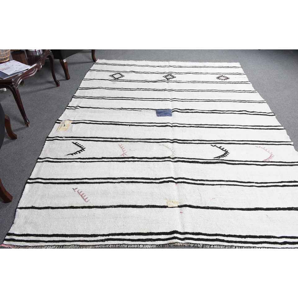 Alfombra vintage, alfombra turca grande de 6.8x9.2 pies, alfombra de lana con motivos de plantas y árboles blancos