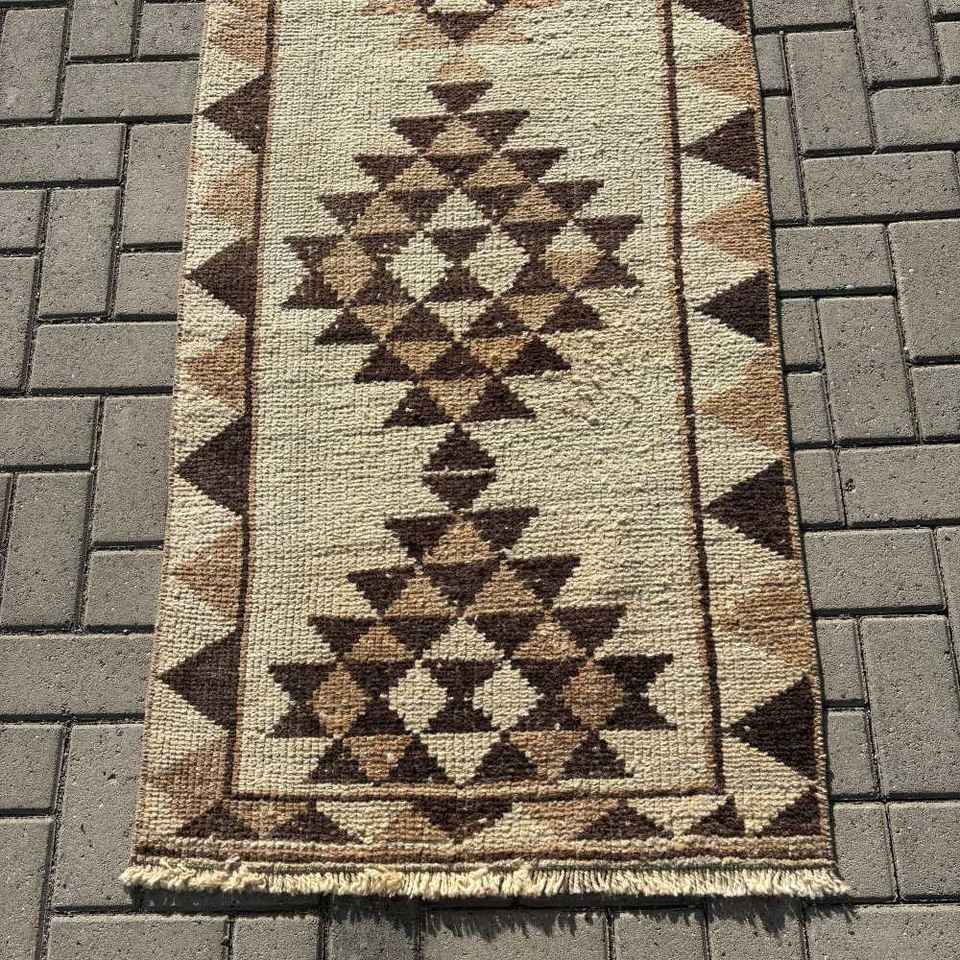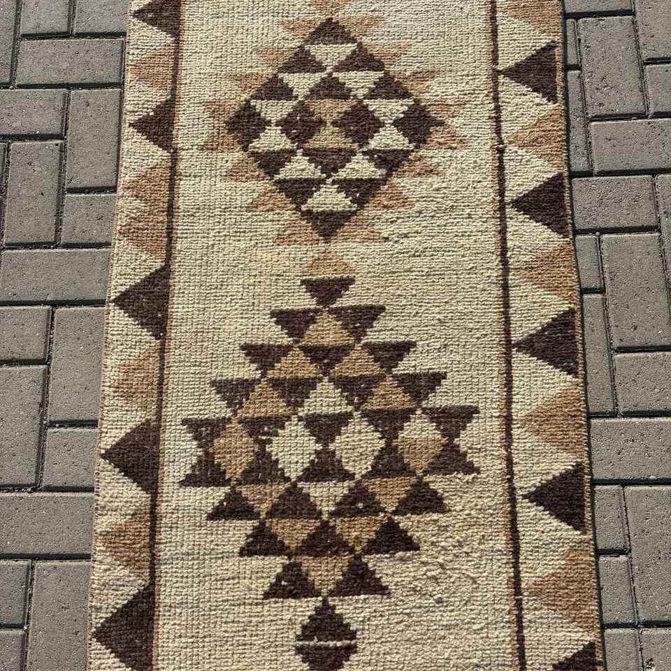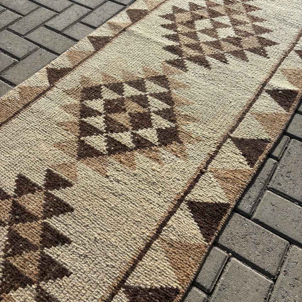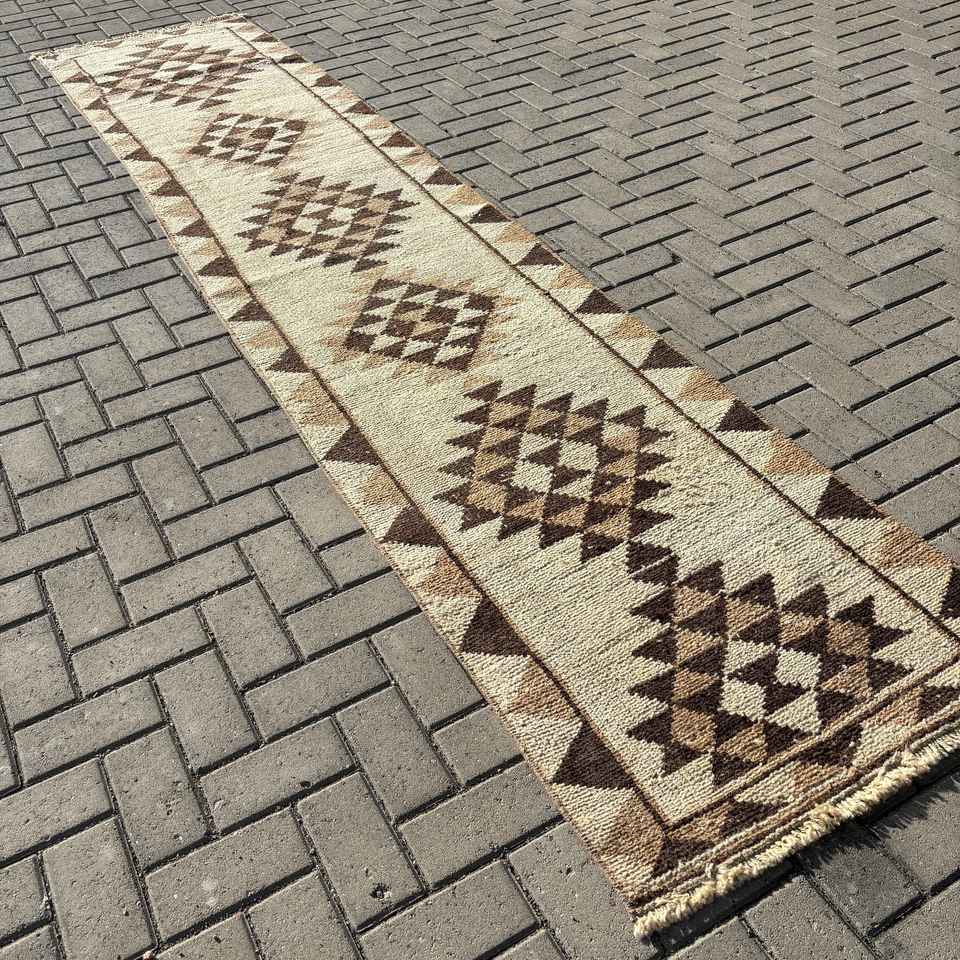 Alfombra Vintage, Alfombra Turca de 2.5x11.7 pies, Alfombra de Lana Marrón con Camuflaje Blanco
