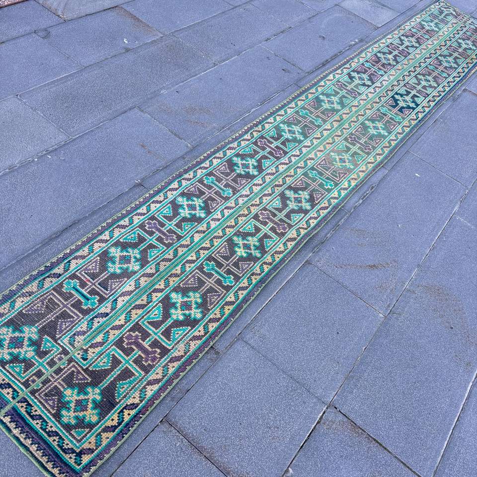 Alfombra Vintage Estilo Runner de 1.7x11.5 pies, Alfombra Ikat Azul Verde de Lana