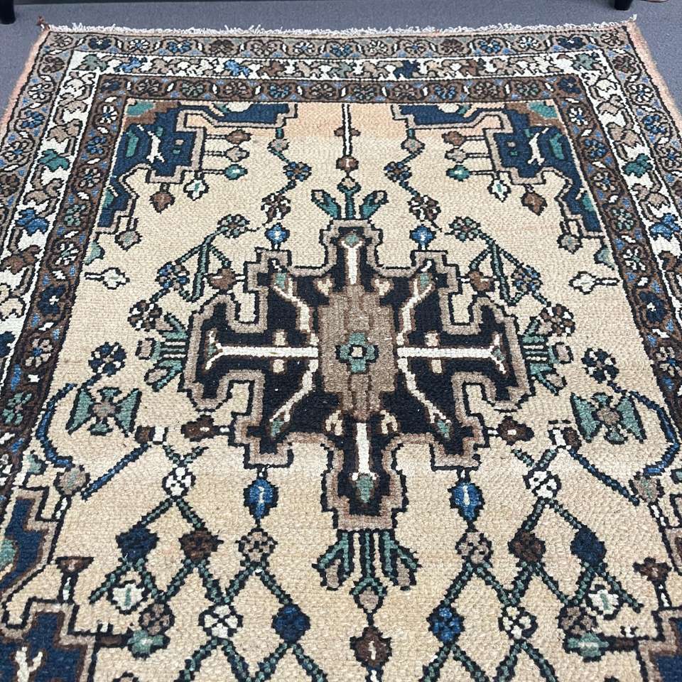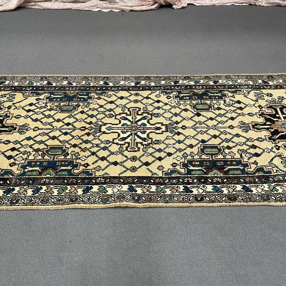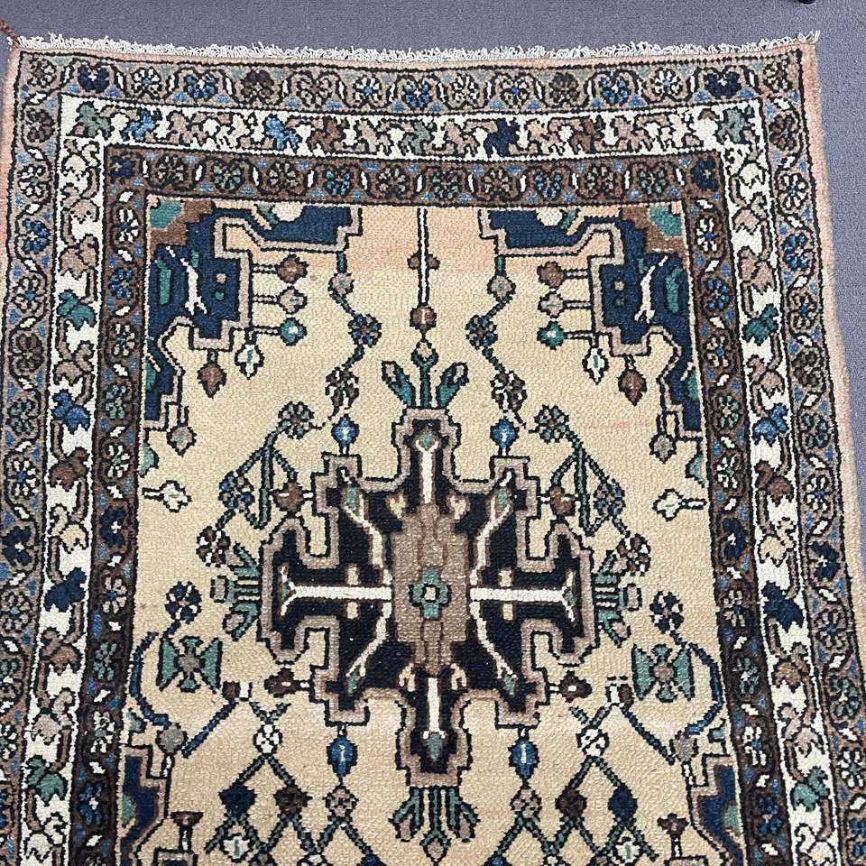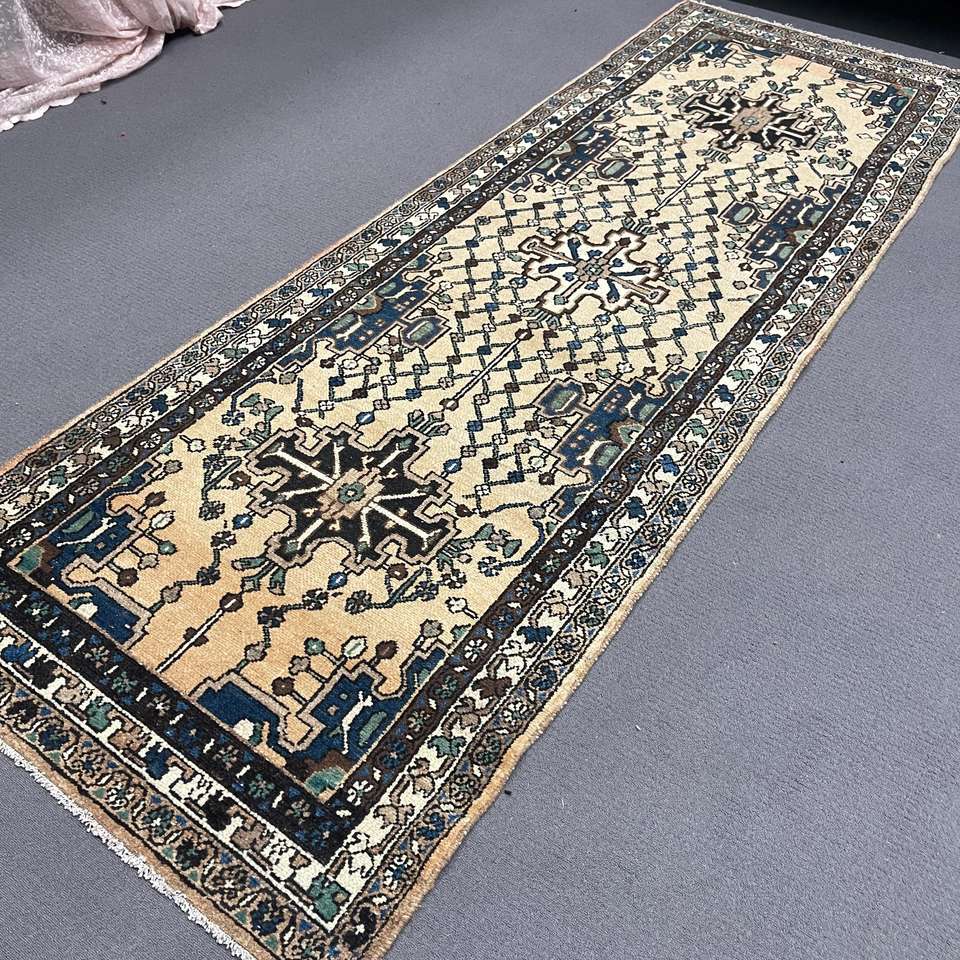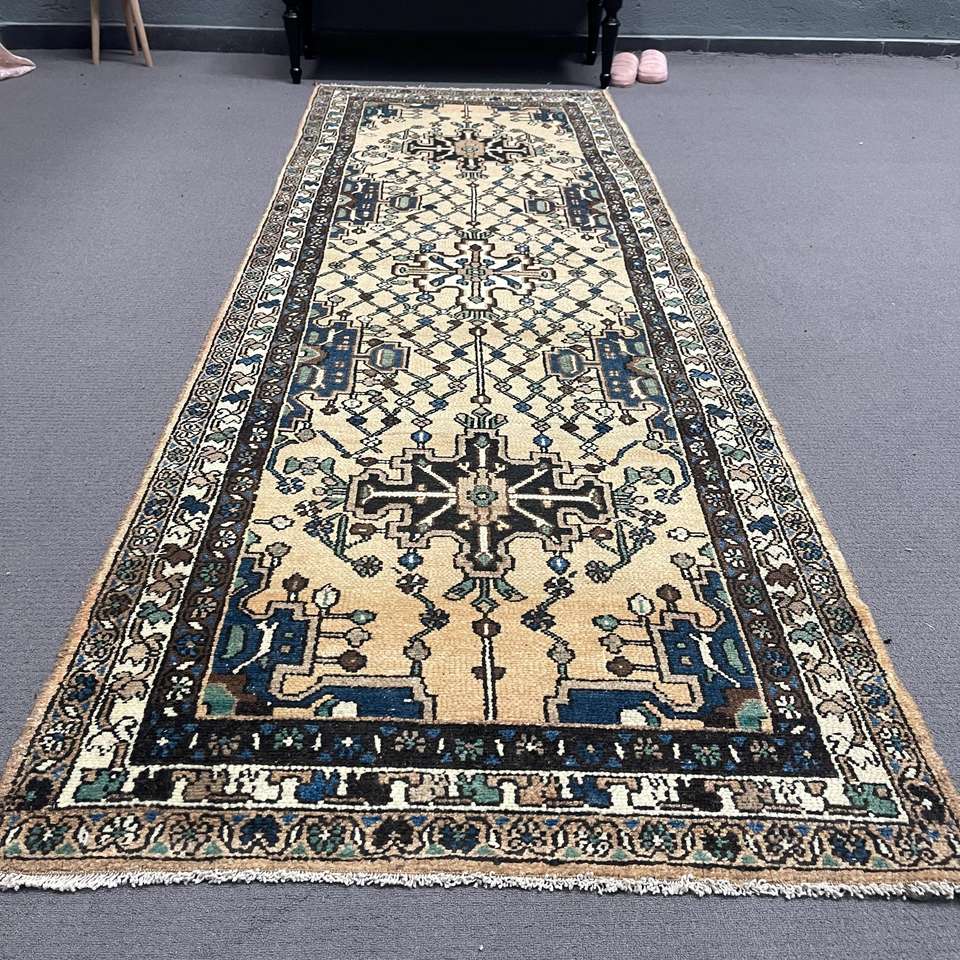 Alfombra Persa Azul Turca Vintage de 3.37x9.9 pies (103x303 cm), de Lana con Diseño de Patchwork, Ecológica con Respaldo de Látex