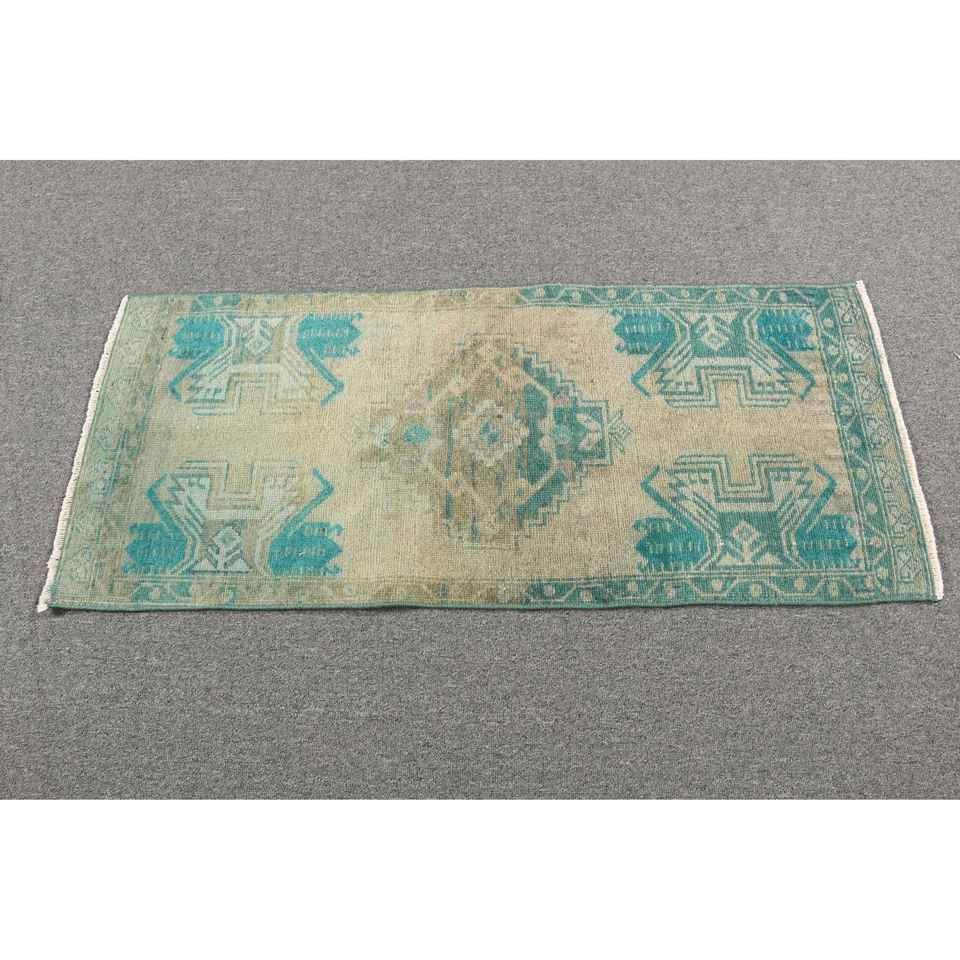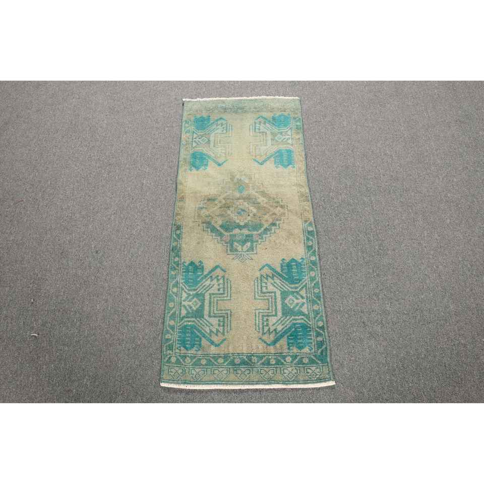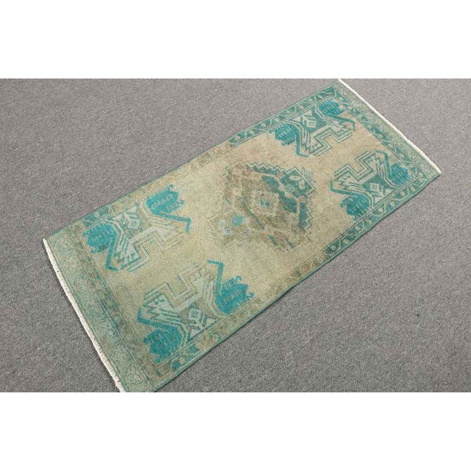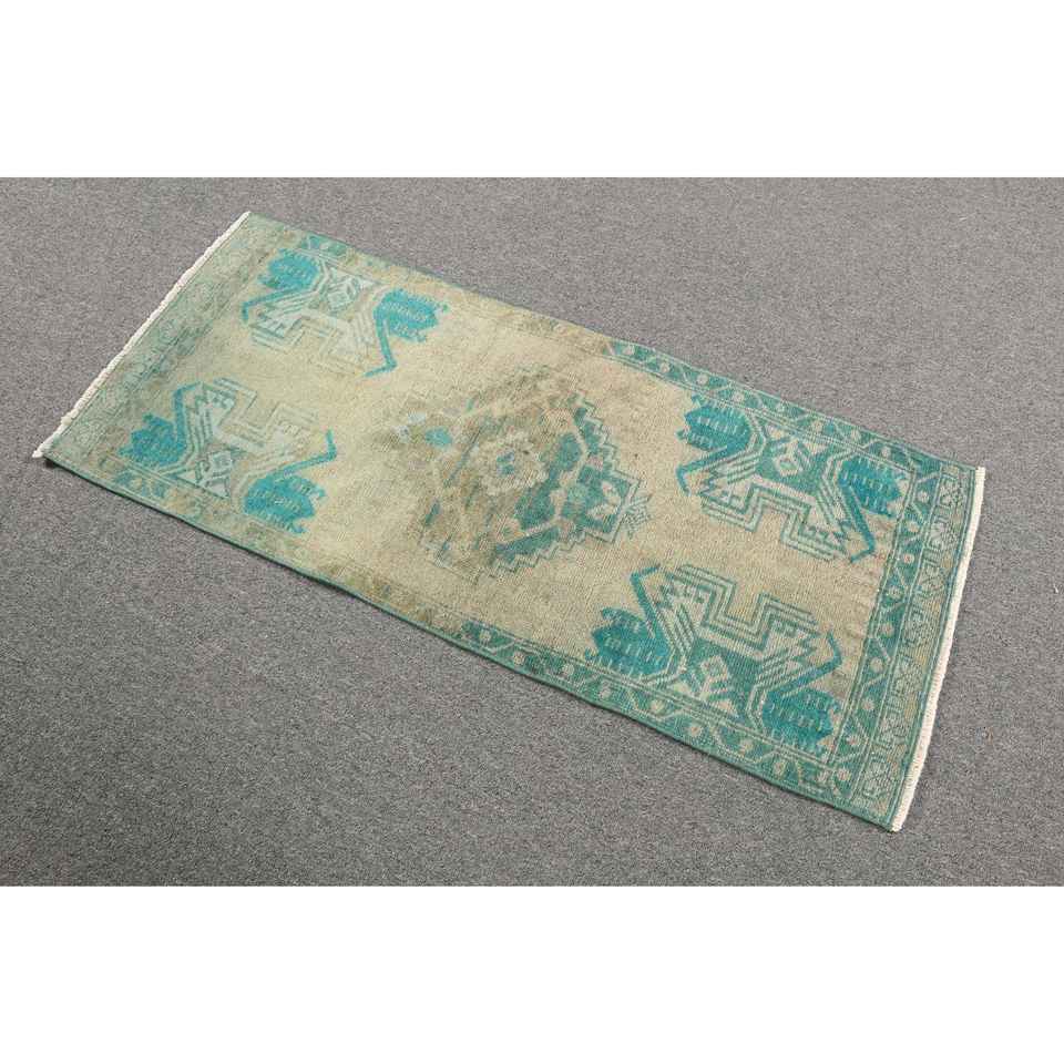 Alfombra pequeña vintage, alfombra turca de 1.5x3.5 pies, alfombra de lana azul con motivos de plantas y árboles