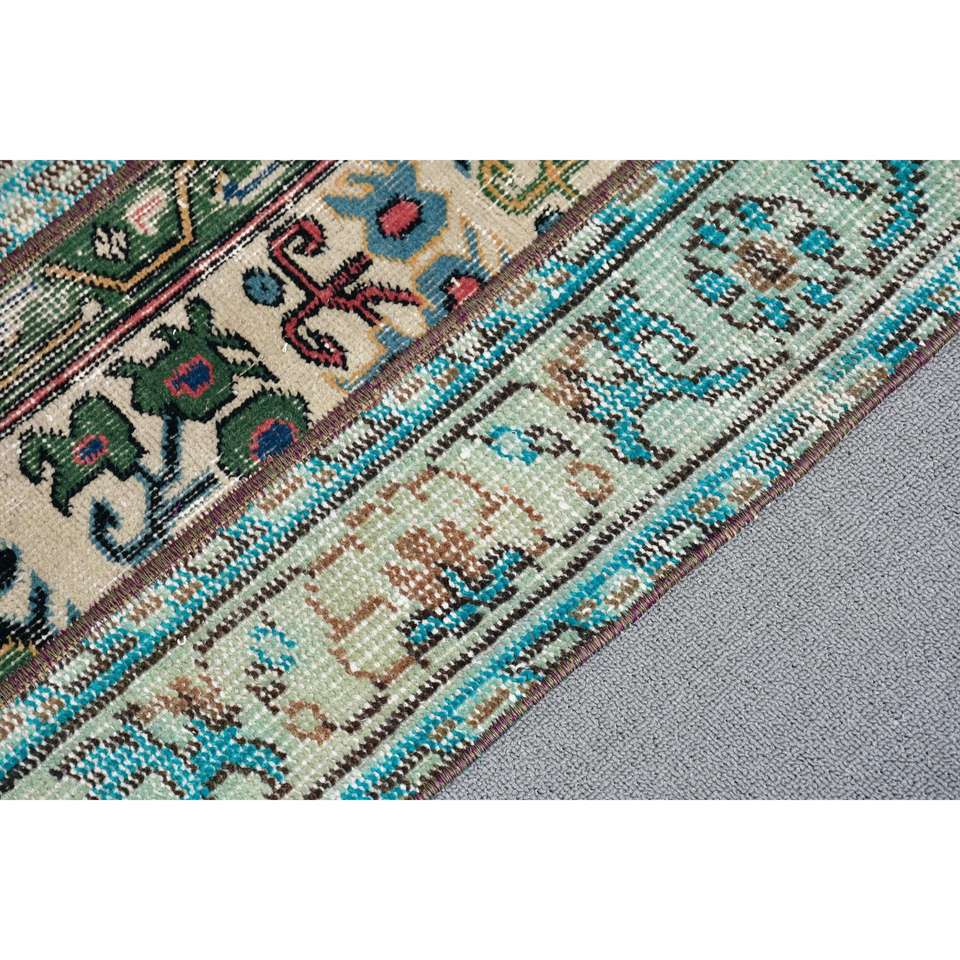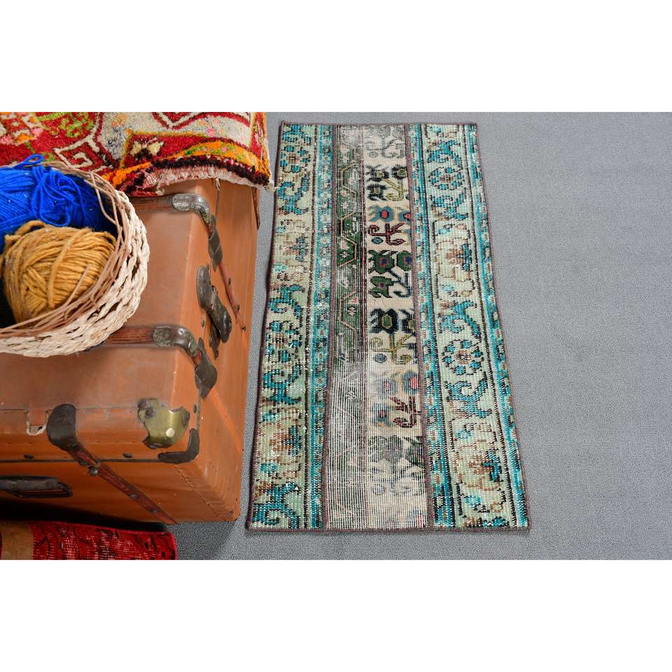 Alfombra Pequeña Vintage de 1.6x3.3 pies (50x101 cm), Alfombra Turca Azul Ombré