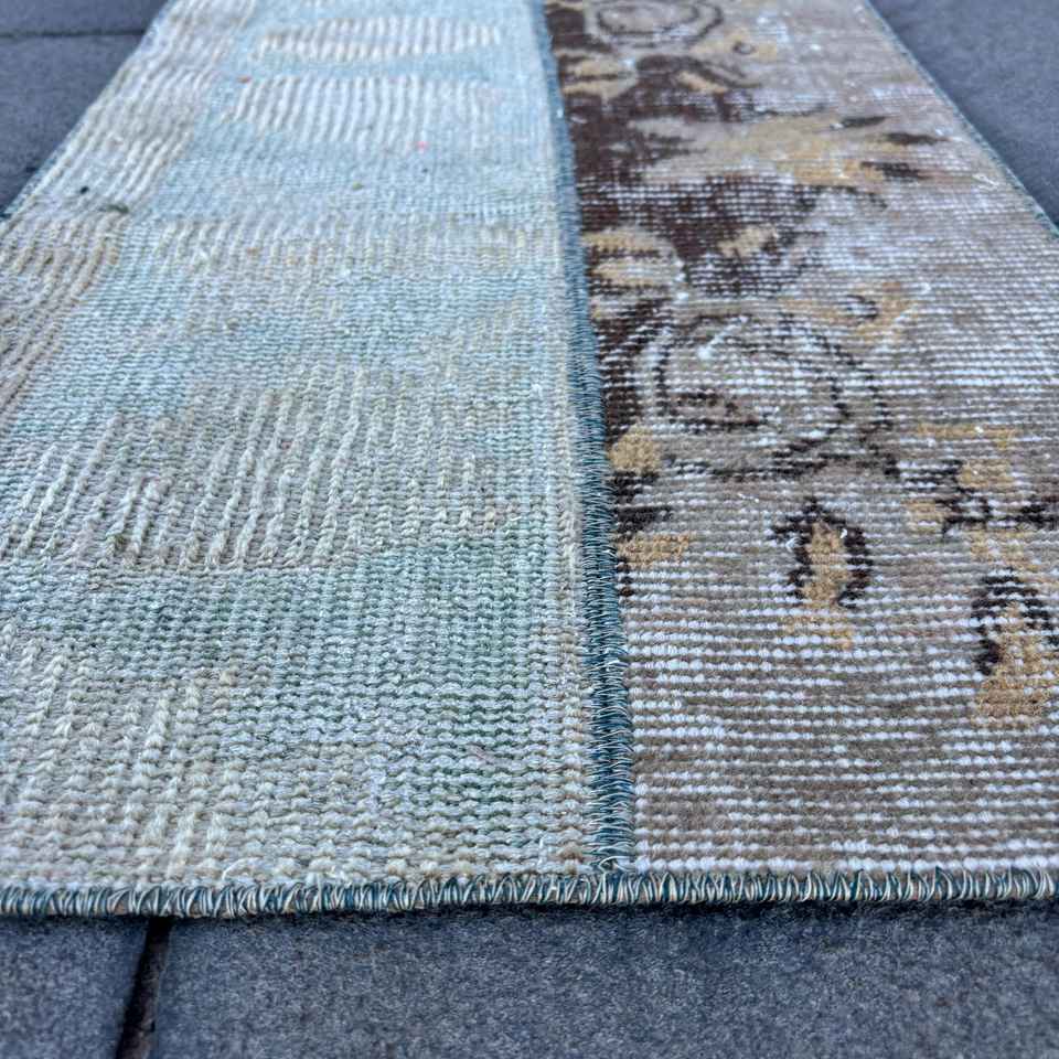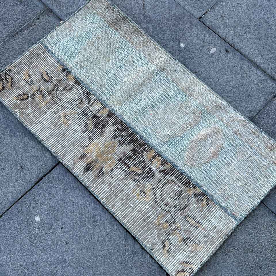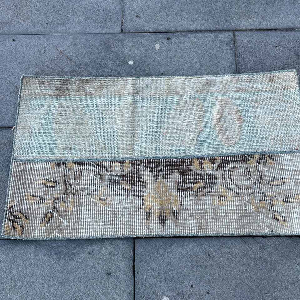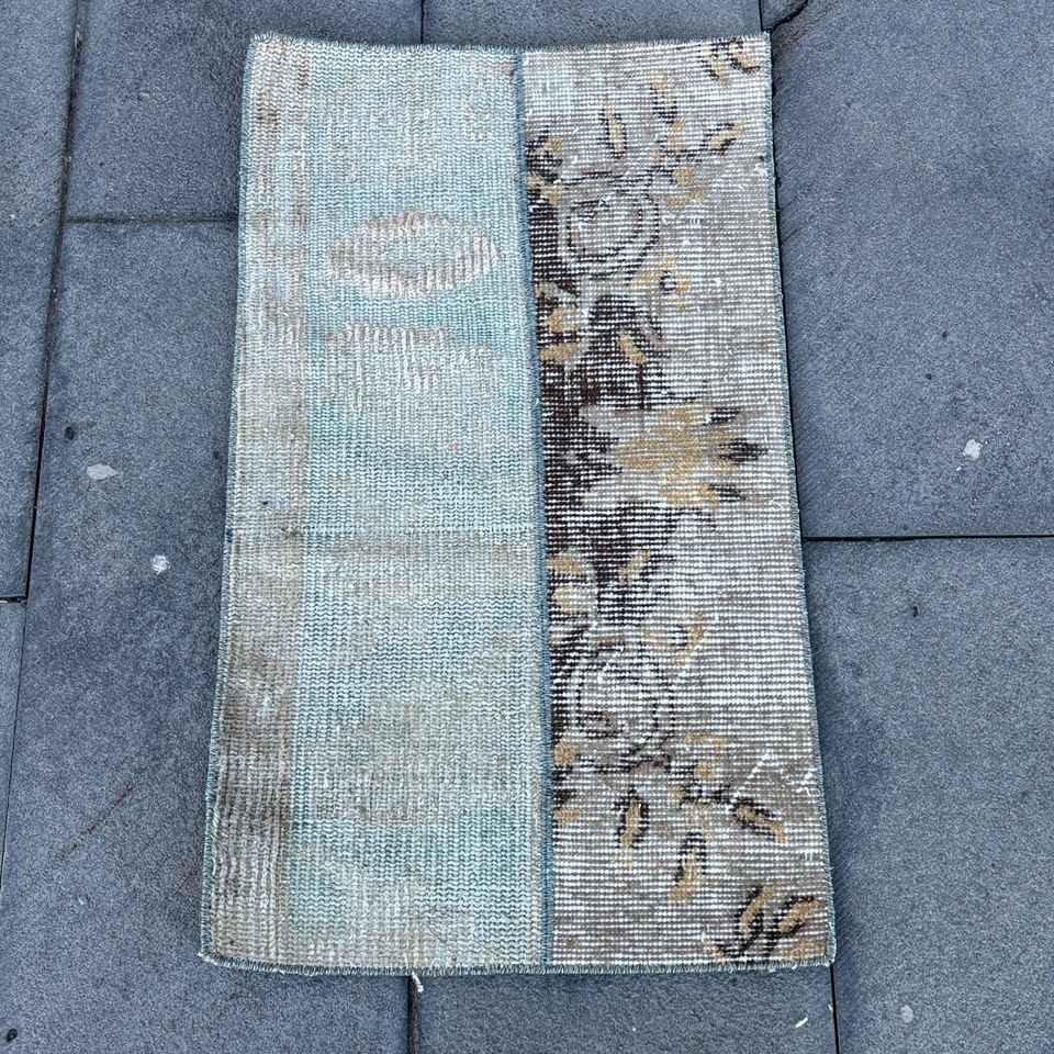 Alfombra Pequeña Vintage, Alfombra Turca de 1.8x2.6 pies, Alfombra de Lana Azul con Diseño de Patchwork