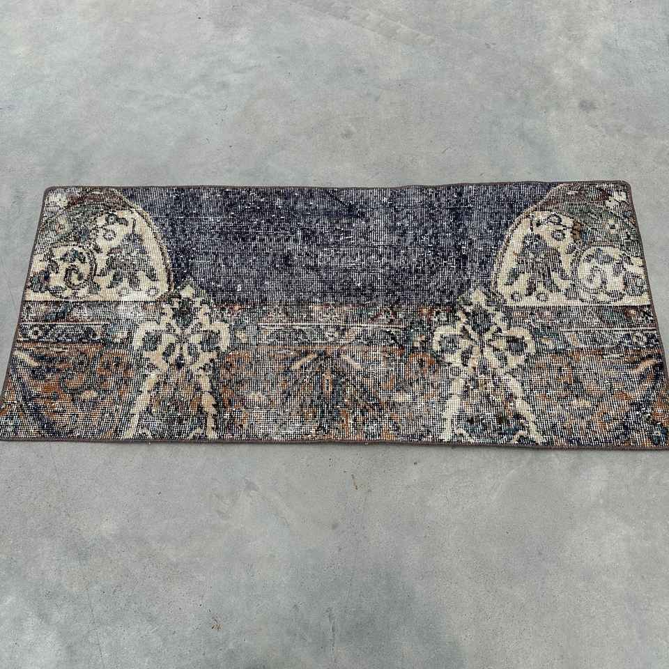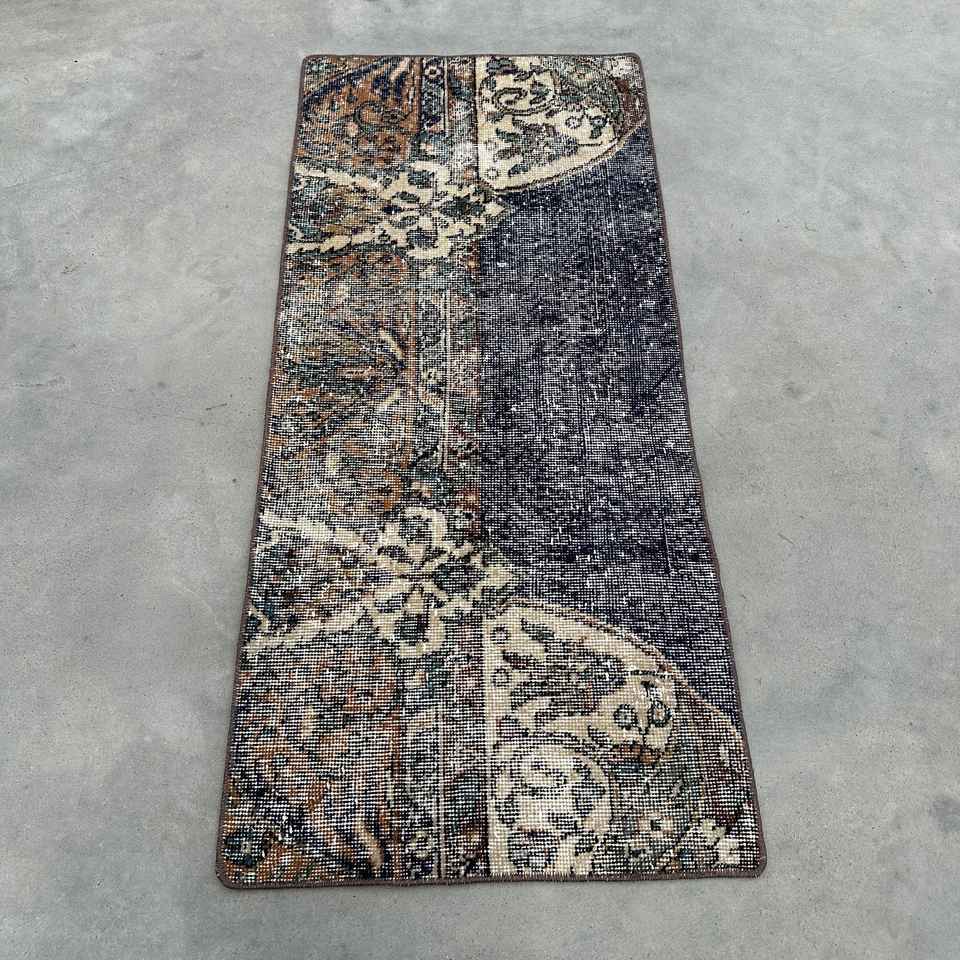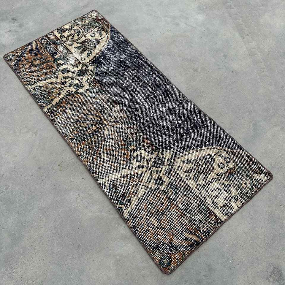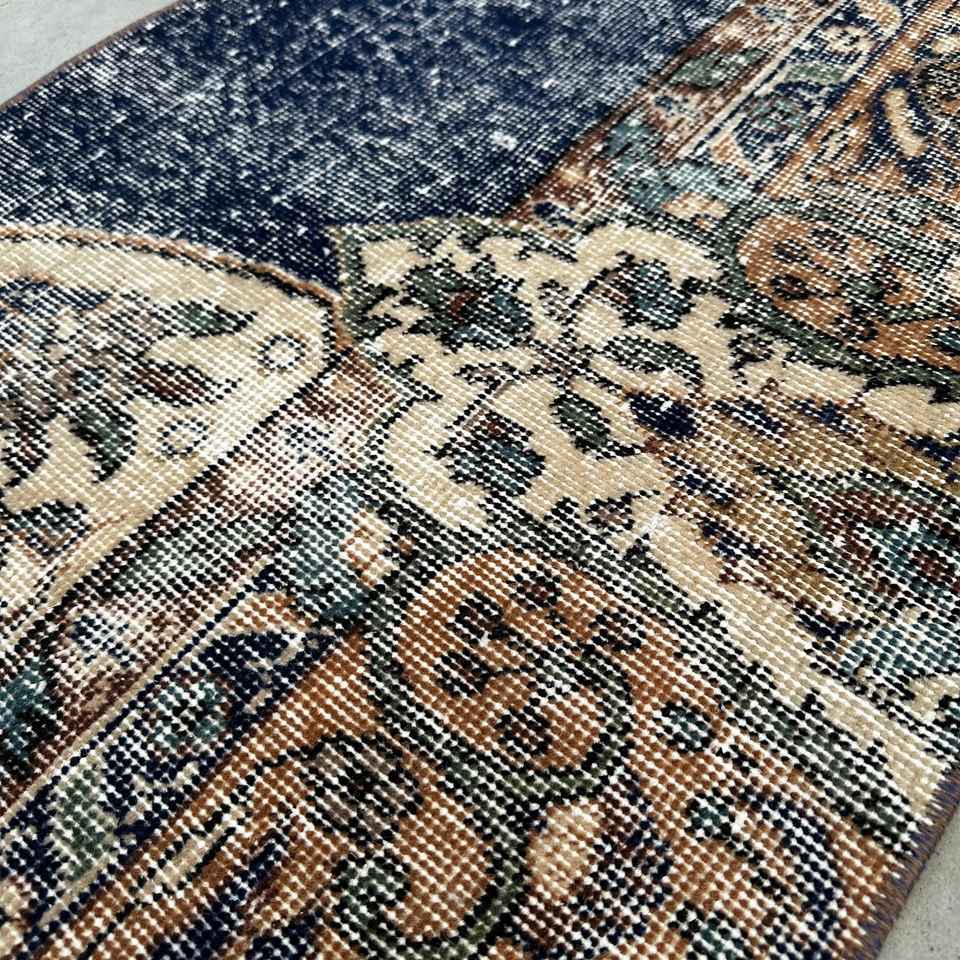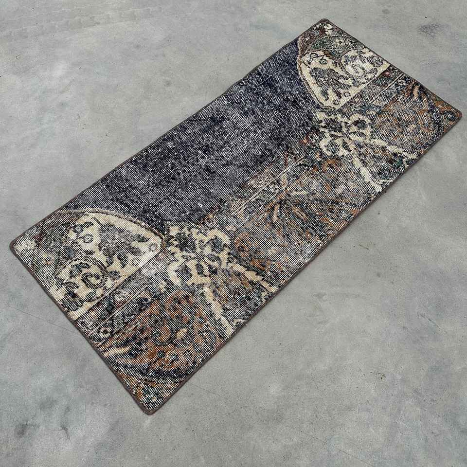 Alfombra Pequeña Vintage de 1.8x4.1 pies (56x125 cm), Alfombra Turca Azul del Suroeste