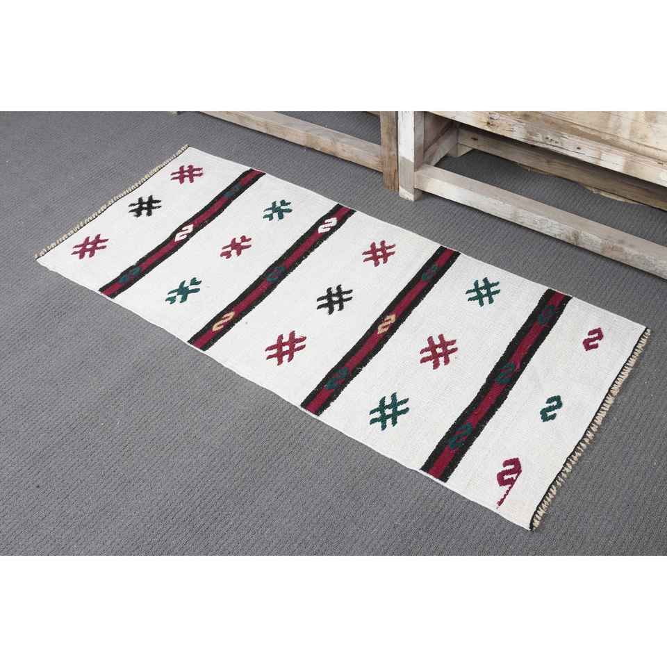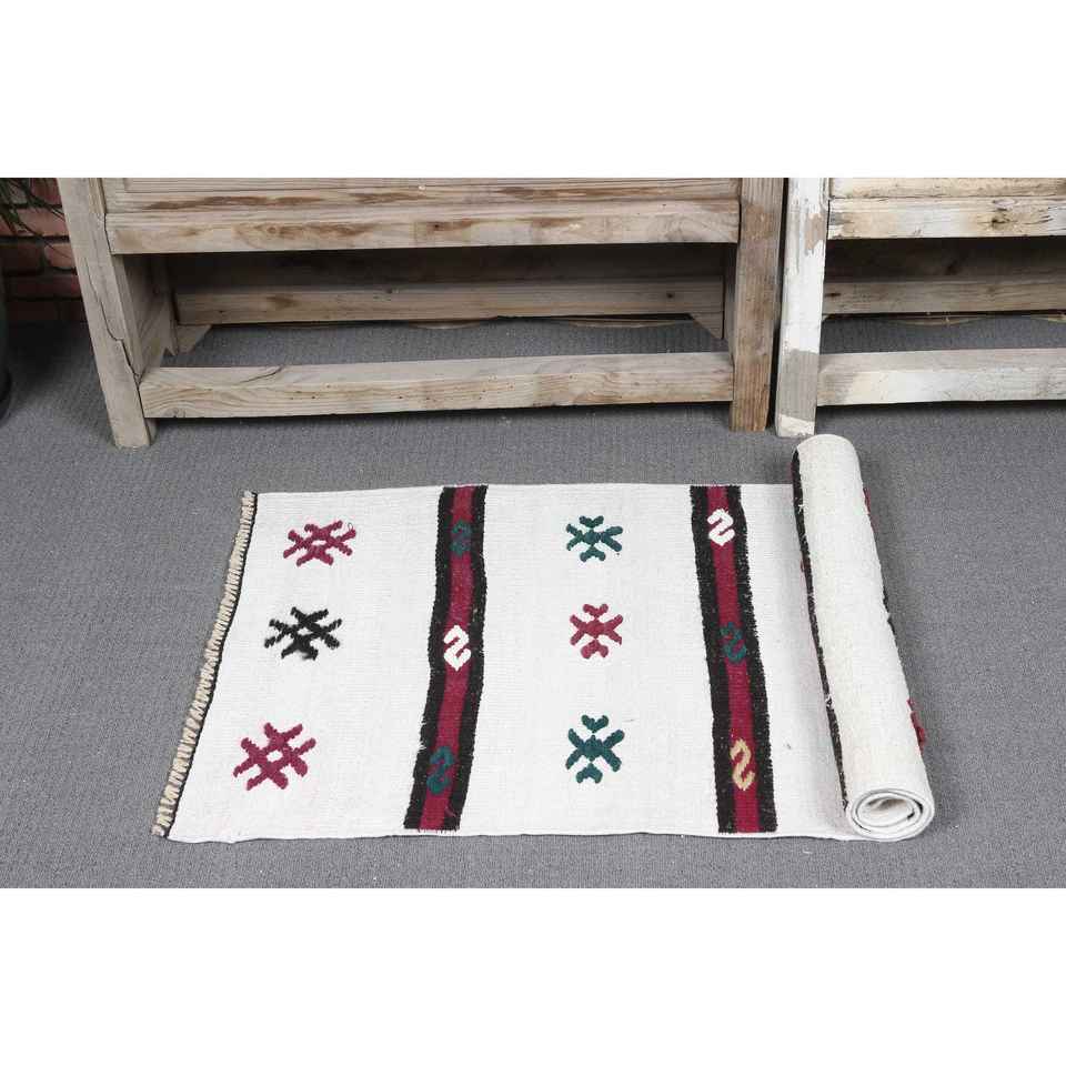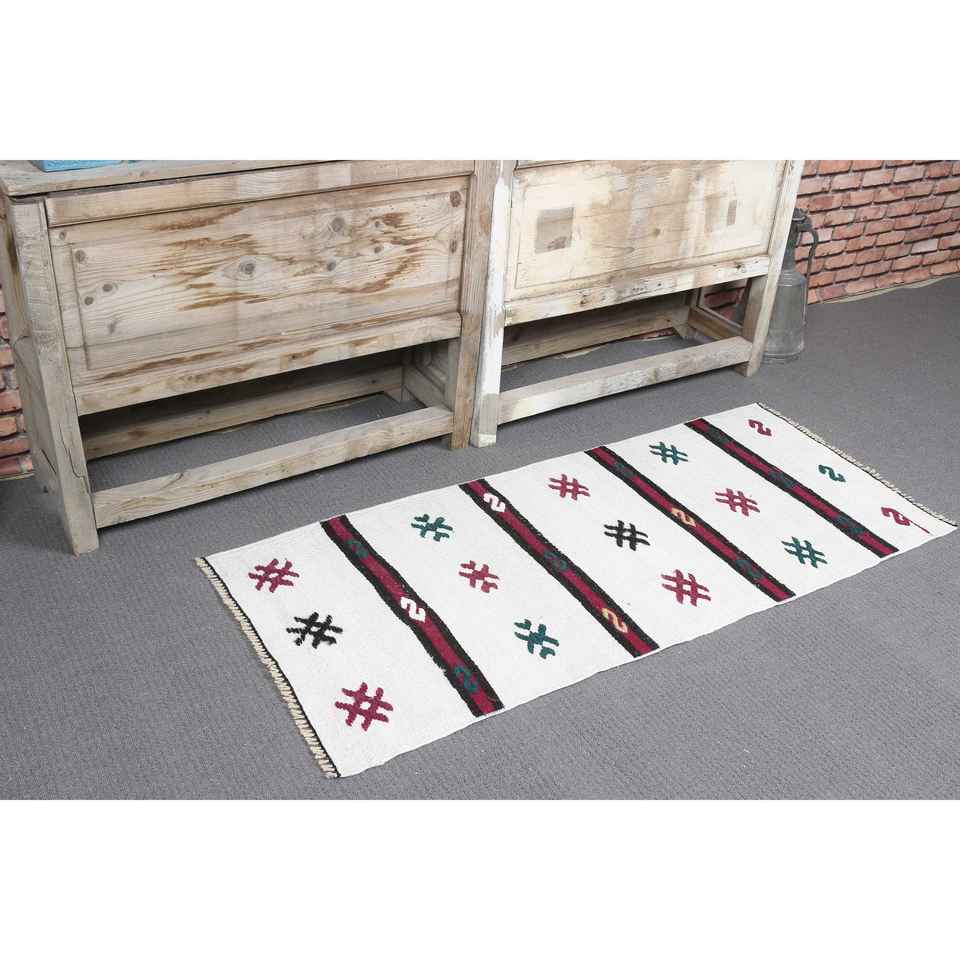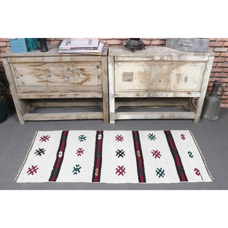 Alfombra Pequeña Vintage de 1.8x4.2 pies, Alfombra Turca Kilim de Lana con Rayas Blancas