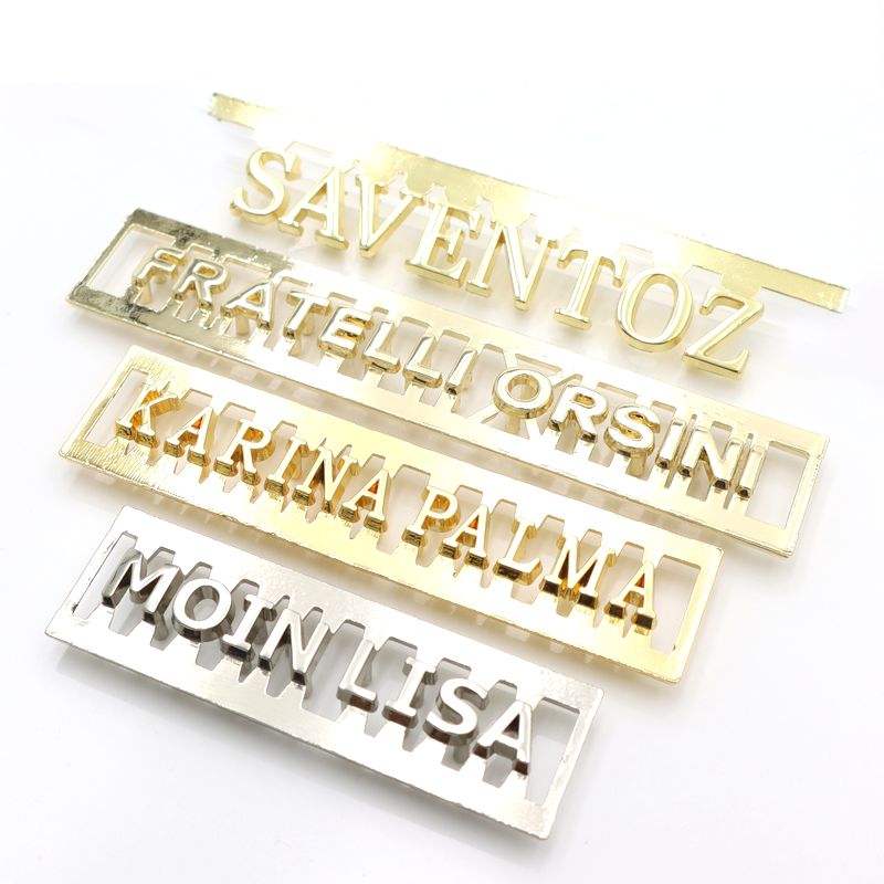Etiqueta de bolso estilo vintage, logotipo personalizado de metal, placa de logotipo con letras separadas