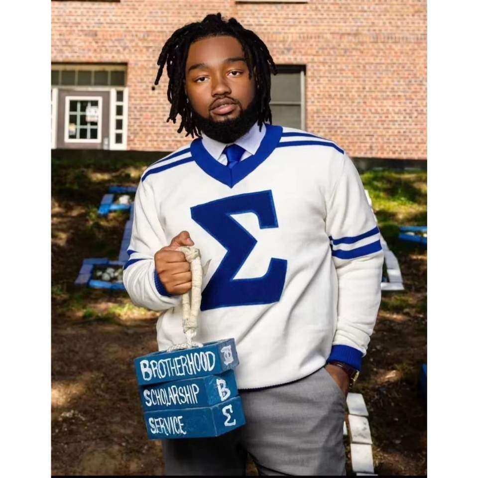 Sudadera Vintage Estilo Phi Beta Sigma con Cuello en V Blanco, Sudadera Universitaria Griega de Fraternidad Big Sigma con Letra Azul, Ropa Personalizada
