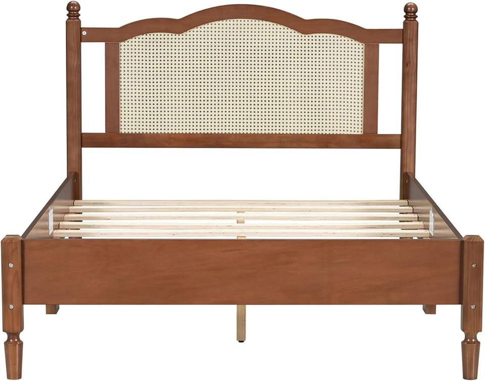 Cama de madera maciza de diseño tradicional vintage, acabado en nogal, plataforma de madera de tamaño completo, cabecero de ratán Natural, Panel de soporte de listón