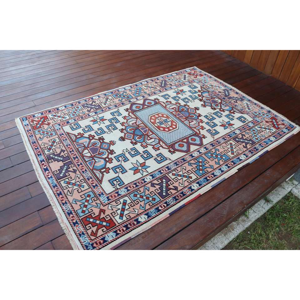 Alfombra Turca Vintage con Acentos Orientales, 4x5.7 pies, Alfombra Oriental Azul de Lana