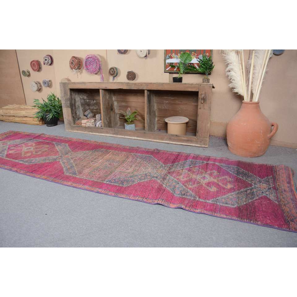 Alfombra Kilim turca Vintage de 2,8x11 pies, rosa, naranja, lana hecha a mano, respaldo de látex, patrón abstracto Rectangular para pasillo de dormitorio