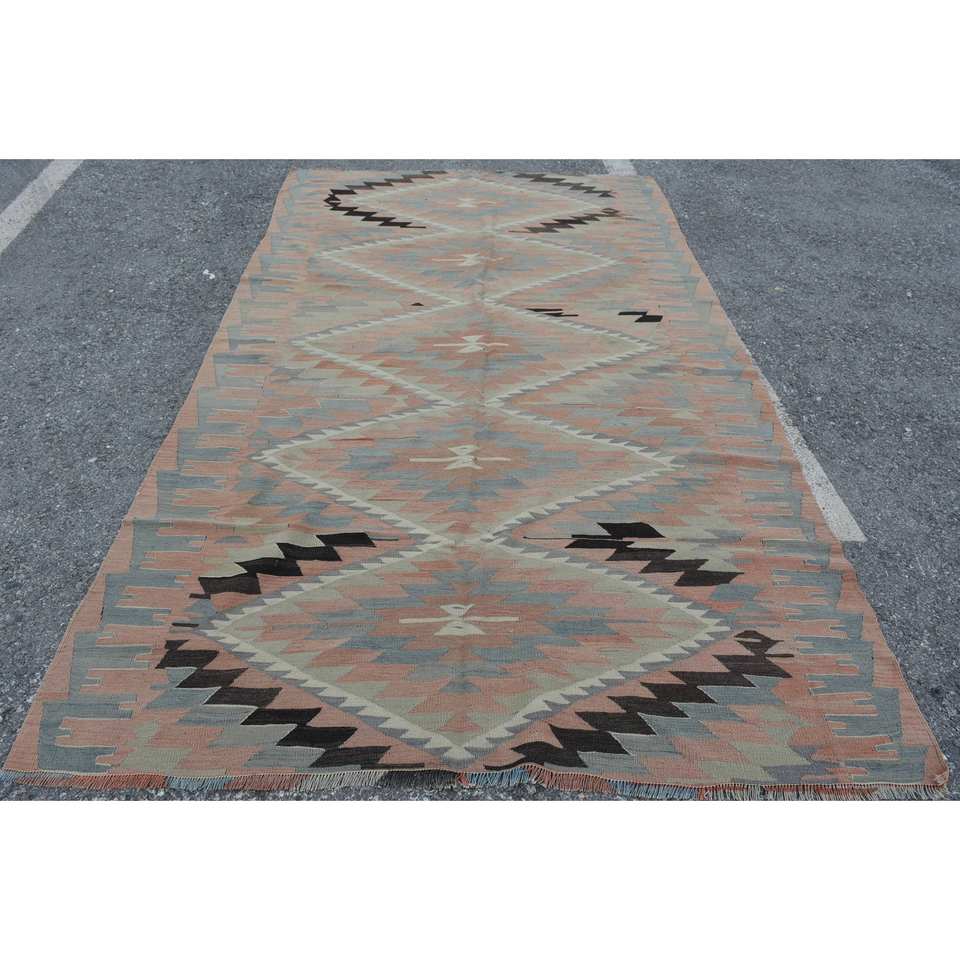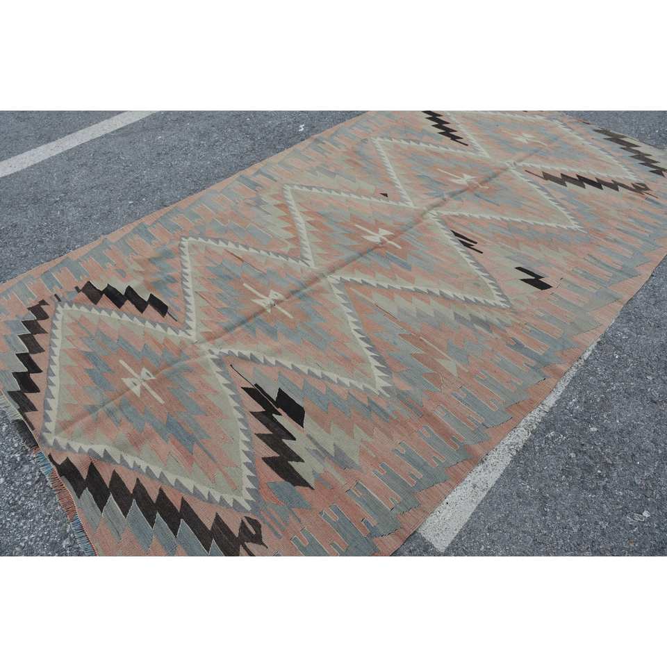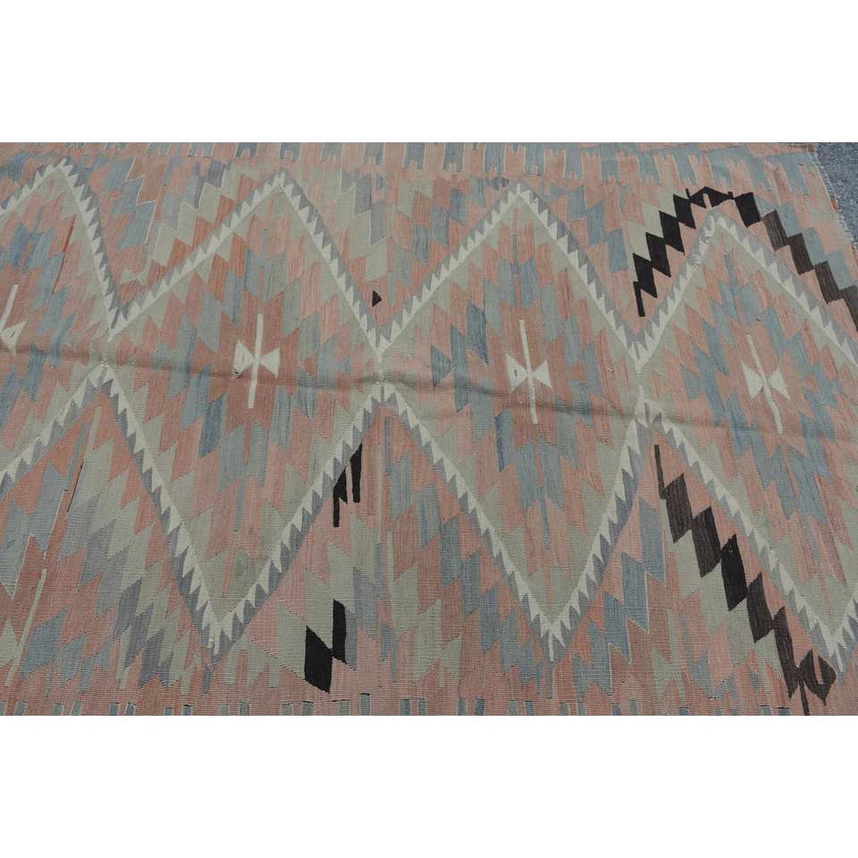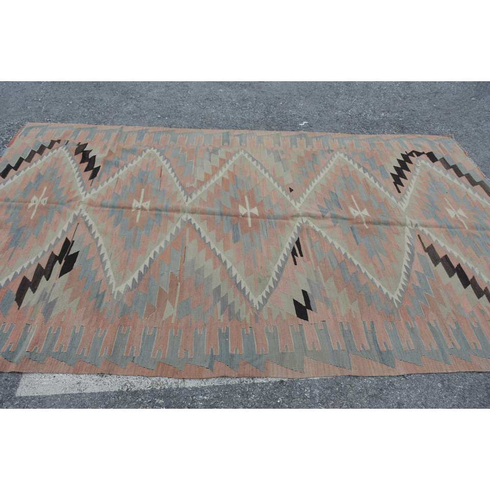 Alfombra de lana Kilim turca Vintage 5,5 pies X 9,5 pies Beige en Beige rectángulo tejido plano ecológico patrón de retazos con respaldo de látex