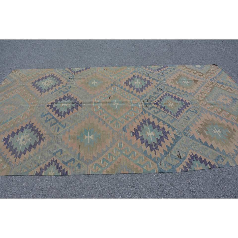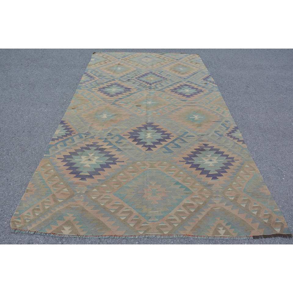 Alfombra Kilim Turca Vintage de 5.6 x 10.1 pies, Diseño a Rayas Beige y Negro, Lana y Látex Ecológicos, Tradicional para Sala de Estar, Pasillo, Habitación Juvenil