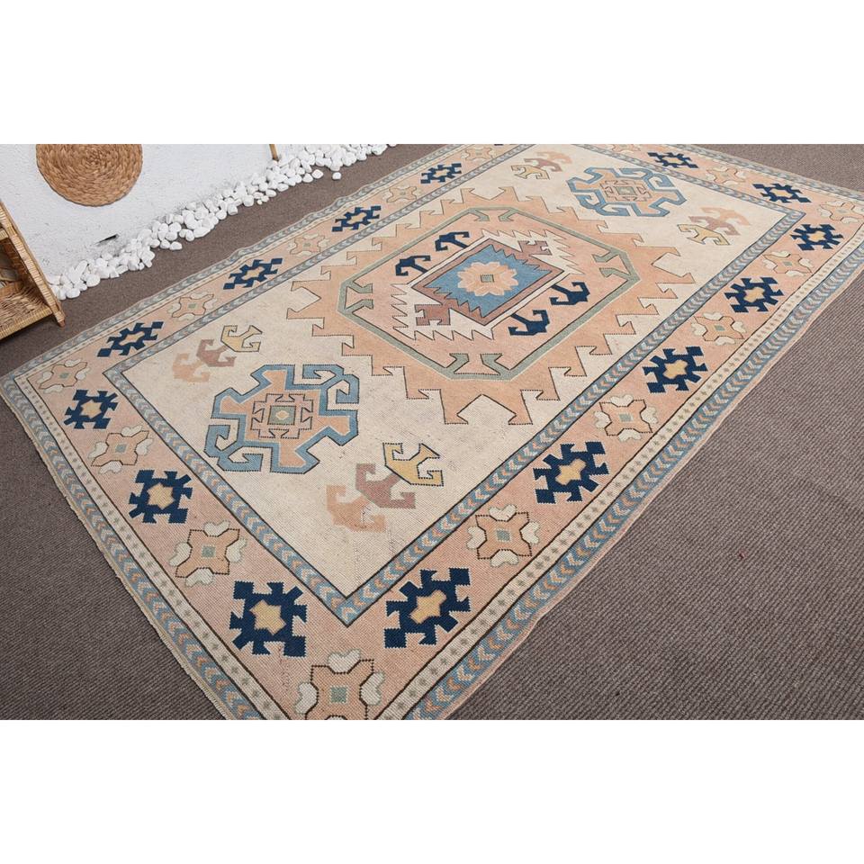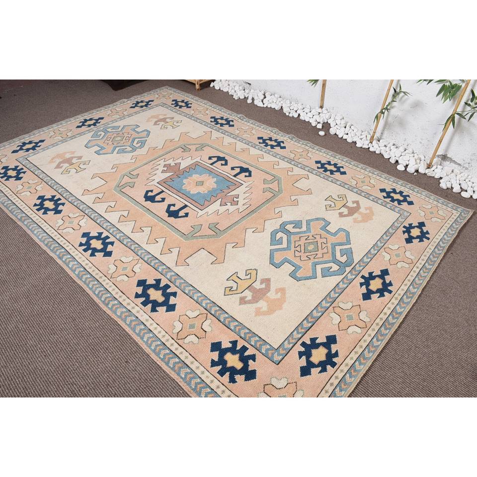 Alfombra de lana Kilim turca Vintage, diseño de retazos beige y azul, forma de pasillo rectangular, 6x8,9 pies, técnica de tejido plano de gran tamaño, látex