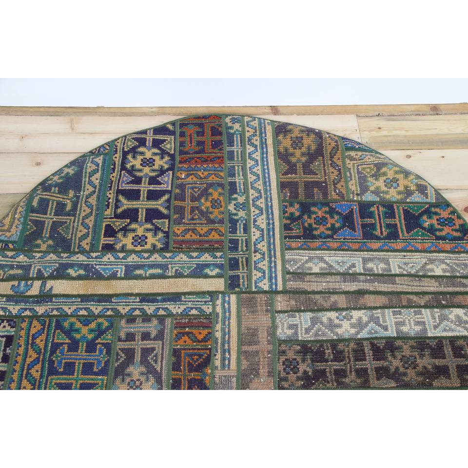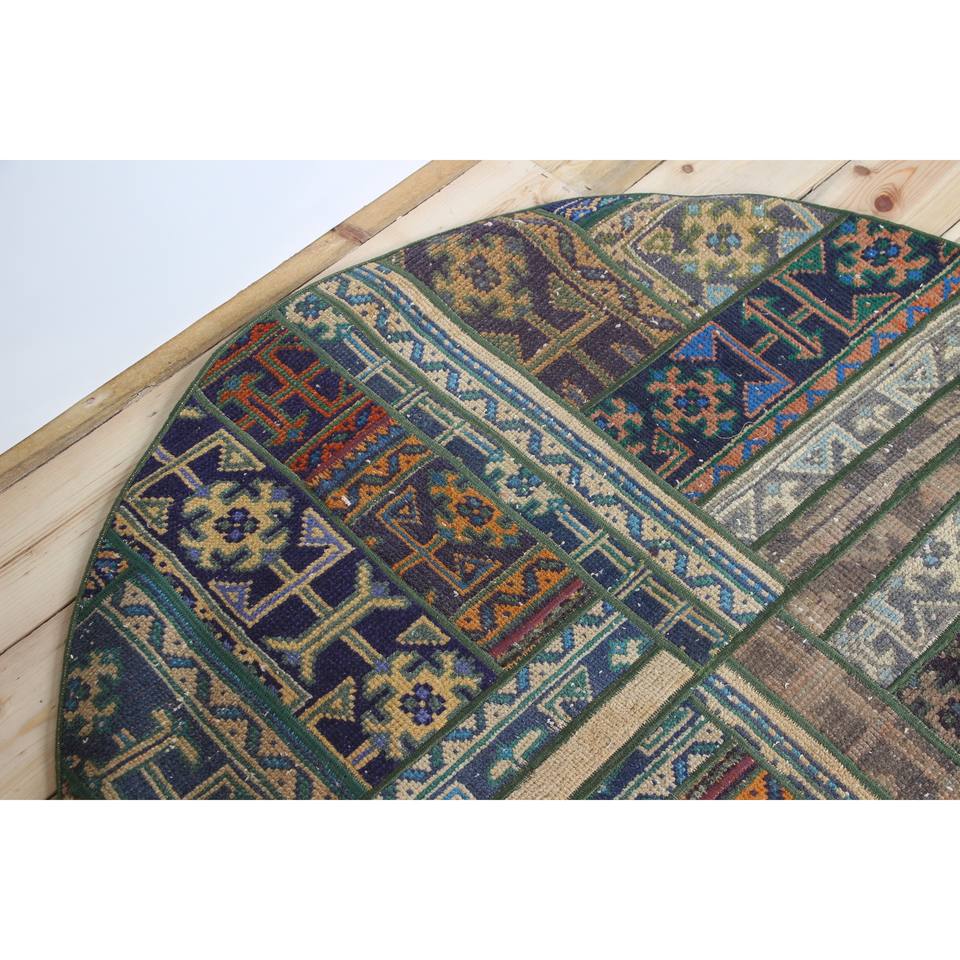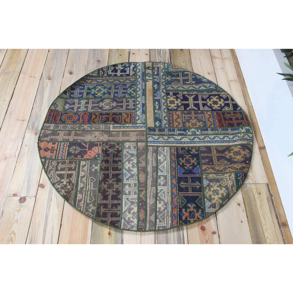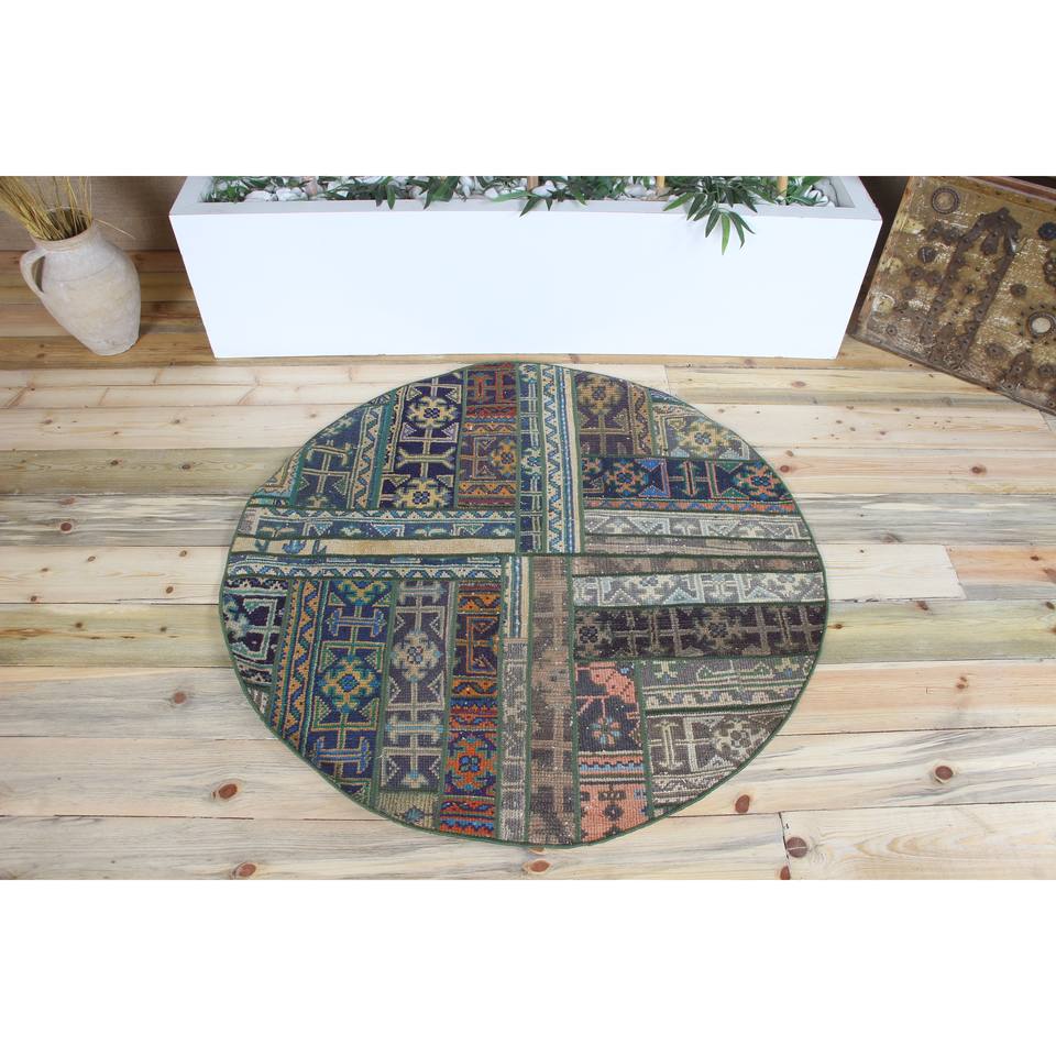 Alfombra Turca Vintage de Patchwork, 3.9x3.9 pies (120x120 cm), Alfombra de Lana Verde con Diseño Geométrico
