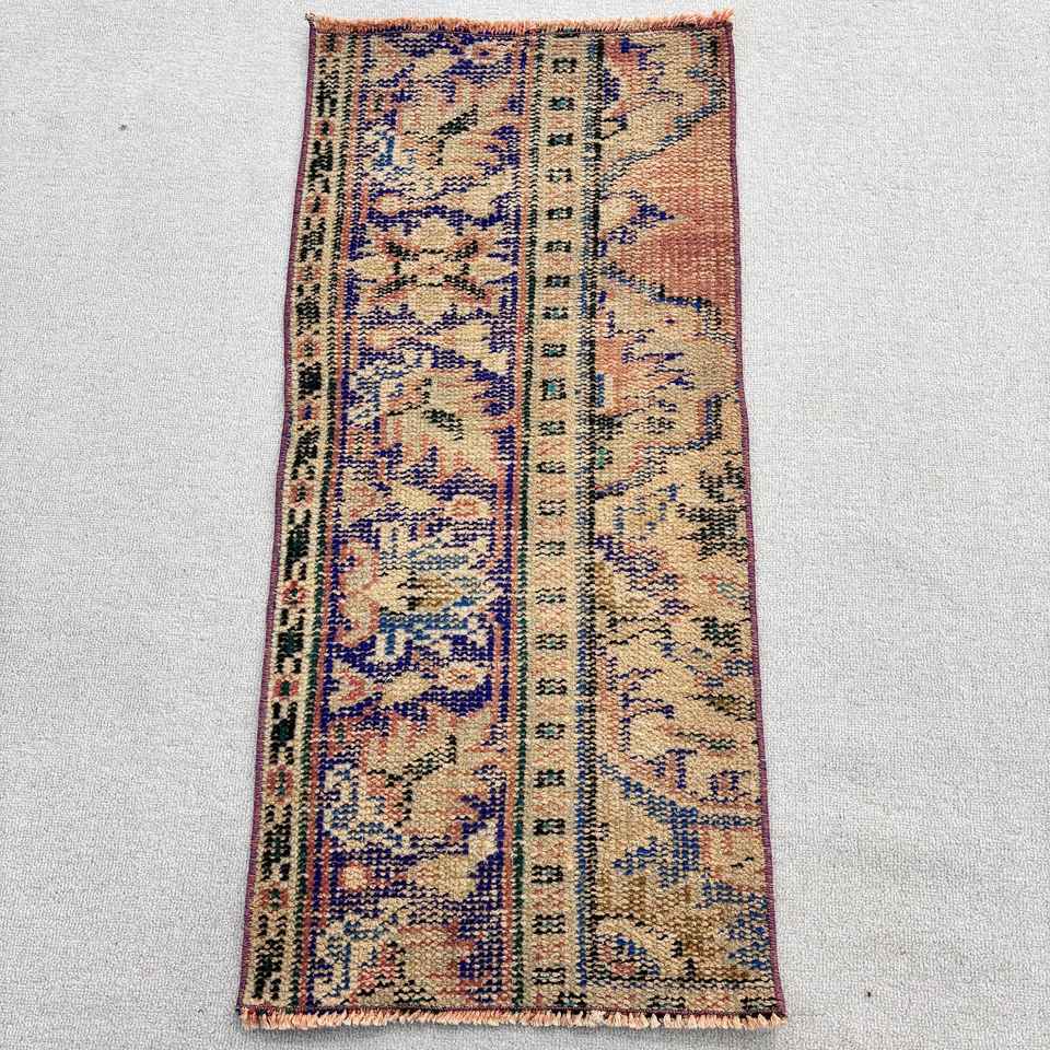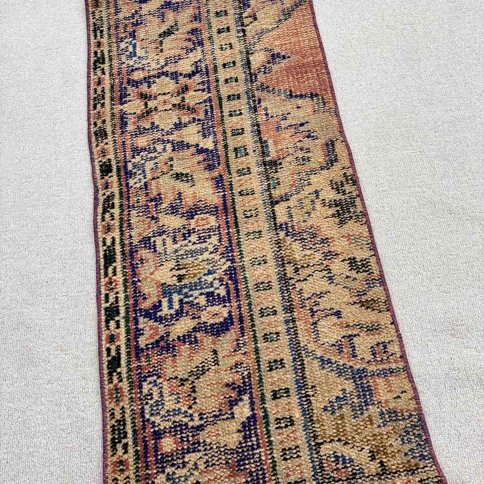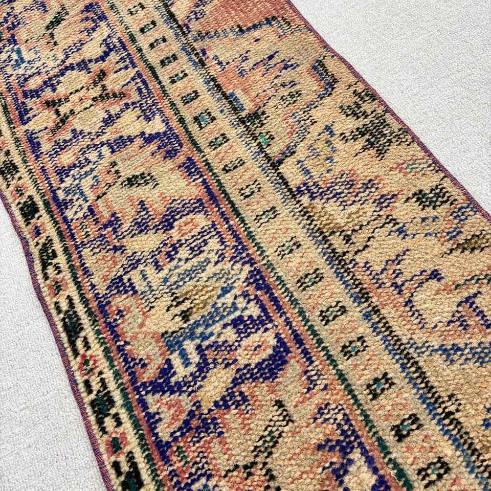 Alfombra Turca Vintage Ecológica de 1.4x3.2 pies (44x96 cm) Azul con Diseño de Patchwork de Lana y Base de Látex