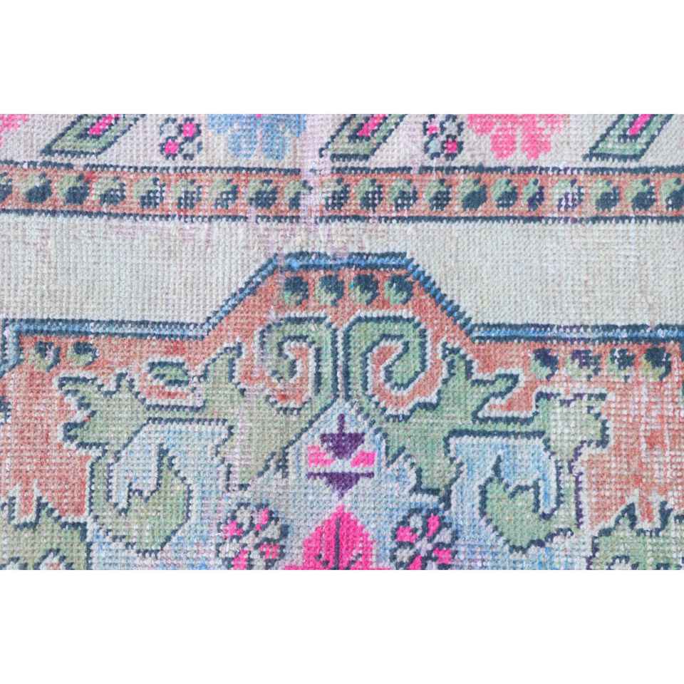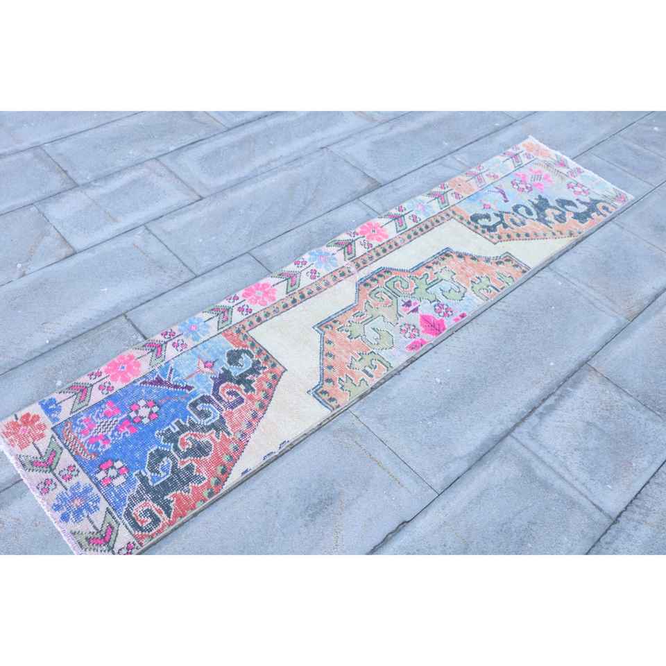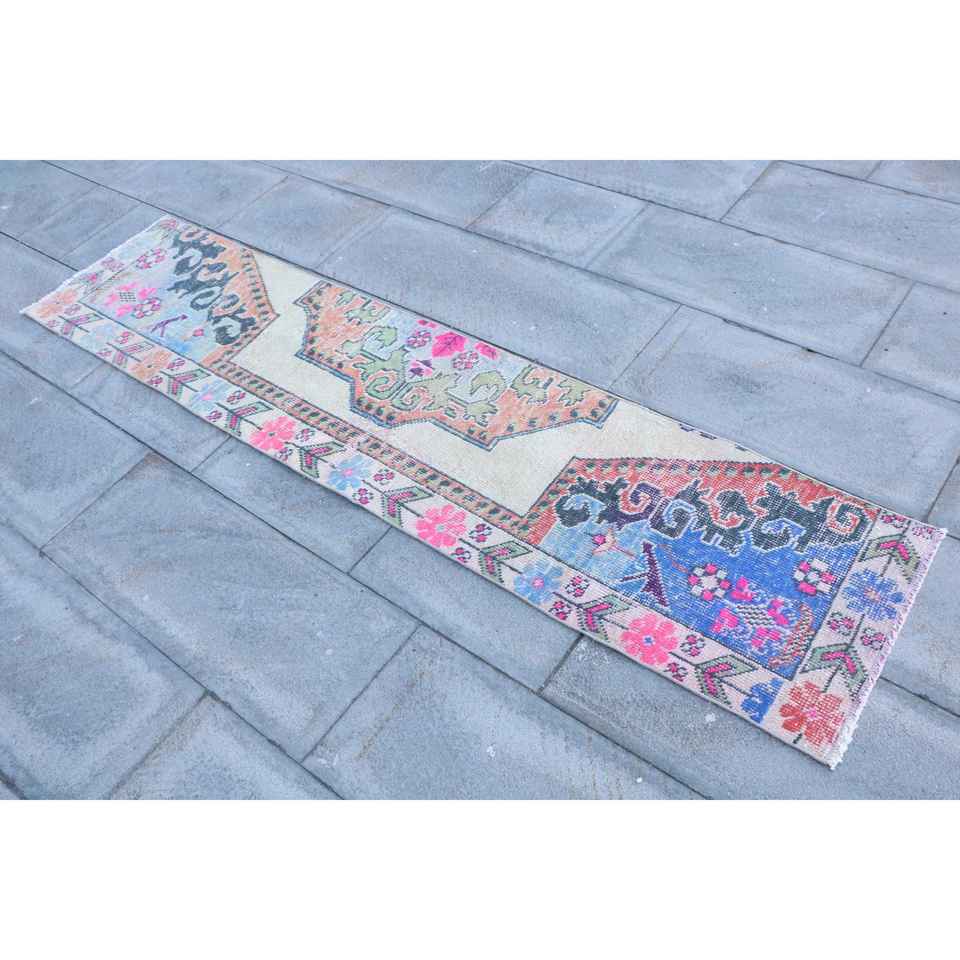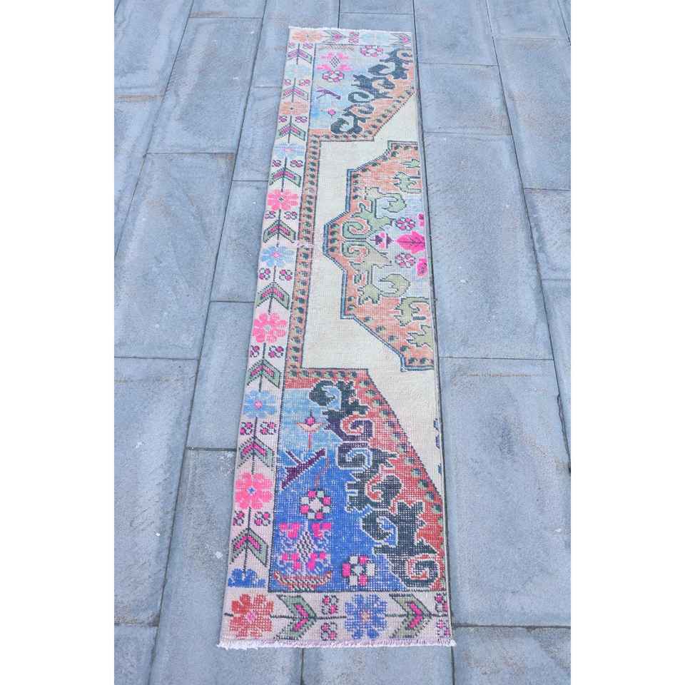 Alfombra Turca Vintage de 1.5x6.9 pies, Alfombra de Lana Azul con Diseño de Patchwork y Base de Látex, Decoración Ecológica para el Hogar