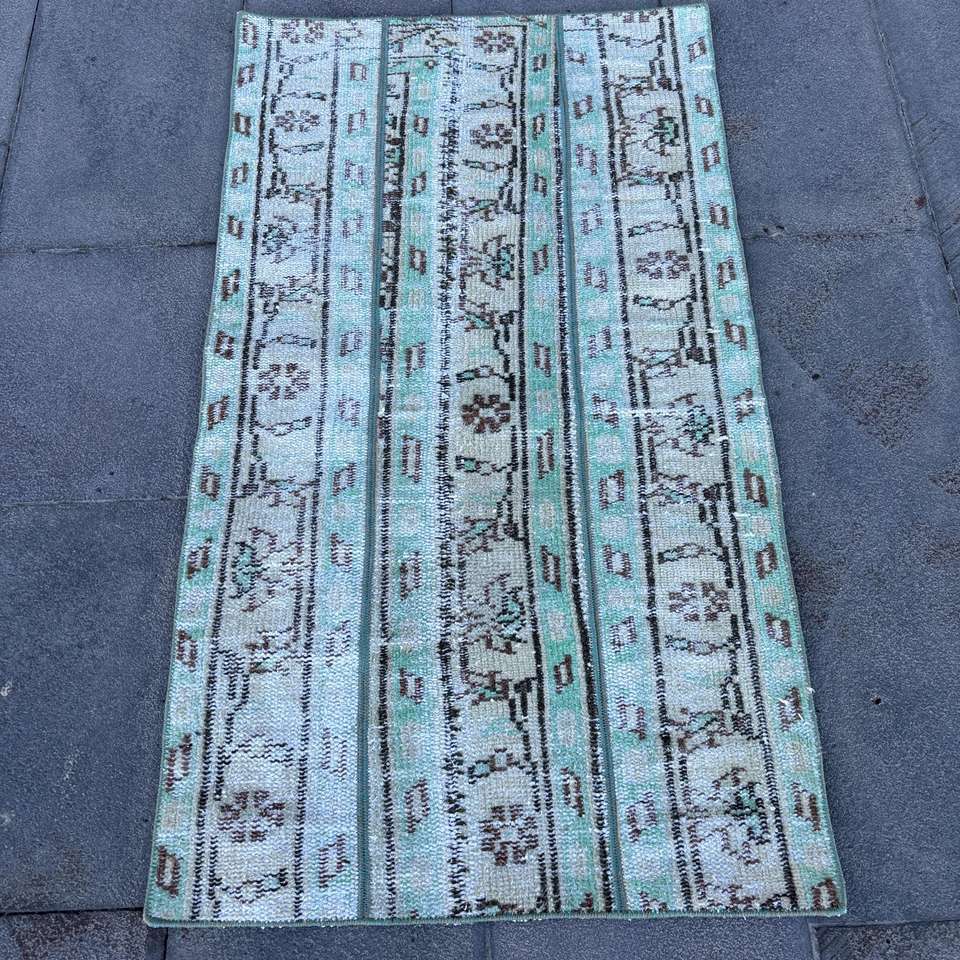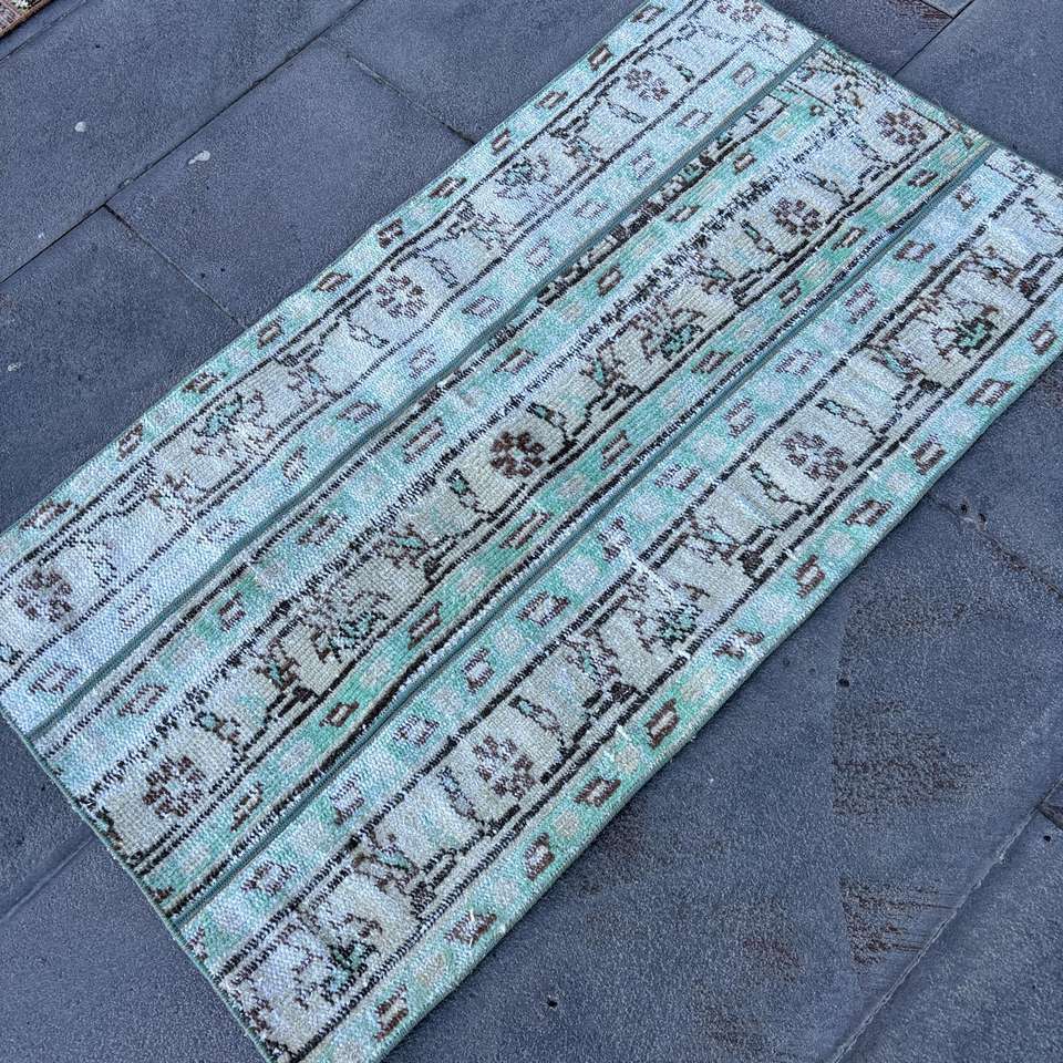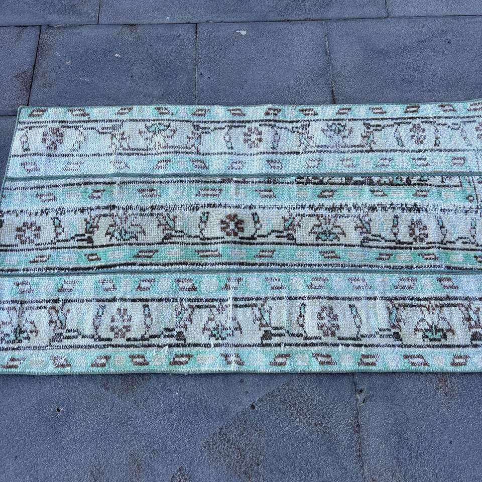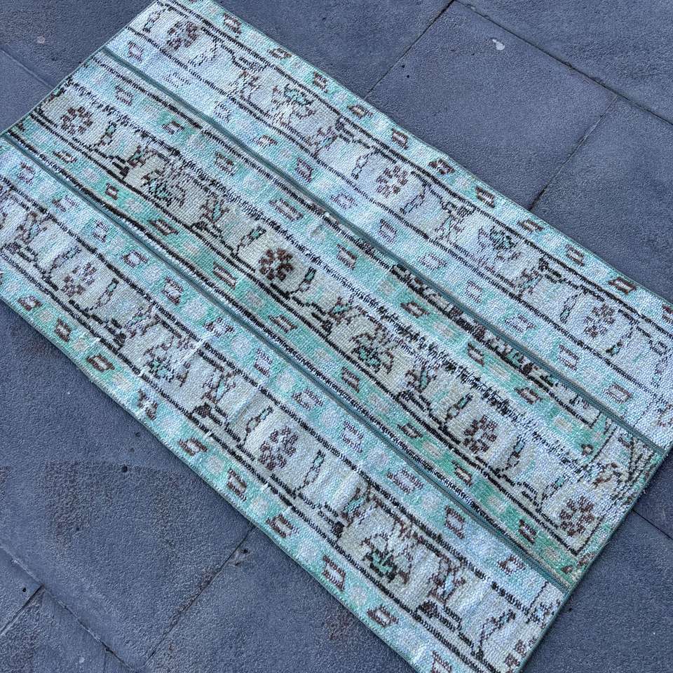 Alfombra Turca Vintage de 2.1x3.8 pies (65x117 cm), Alfombra a Rayas Azul Gris