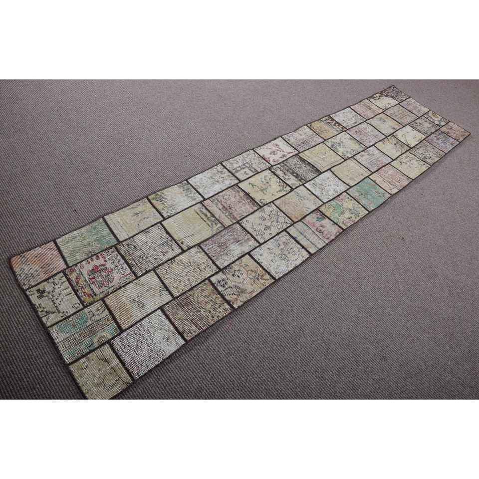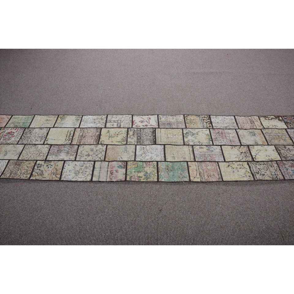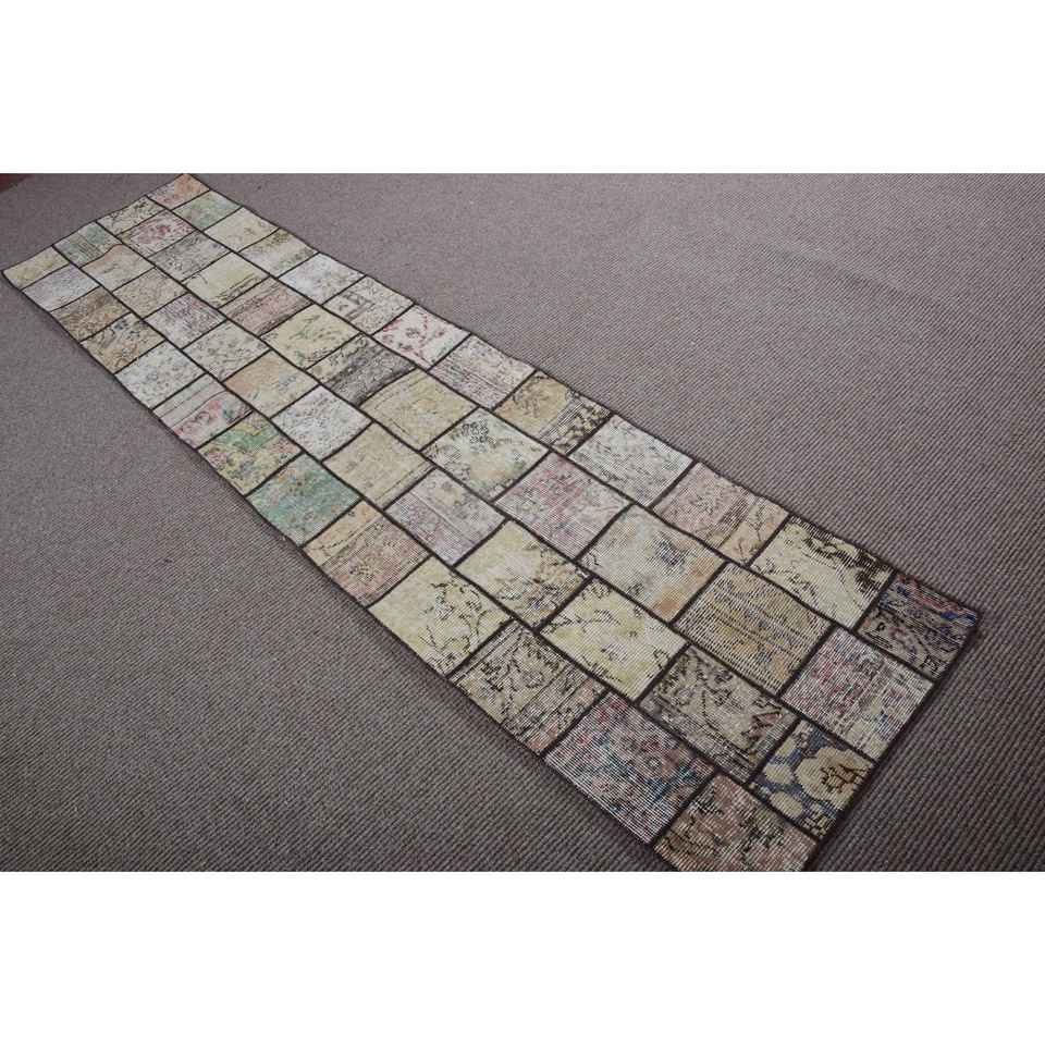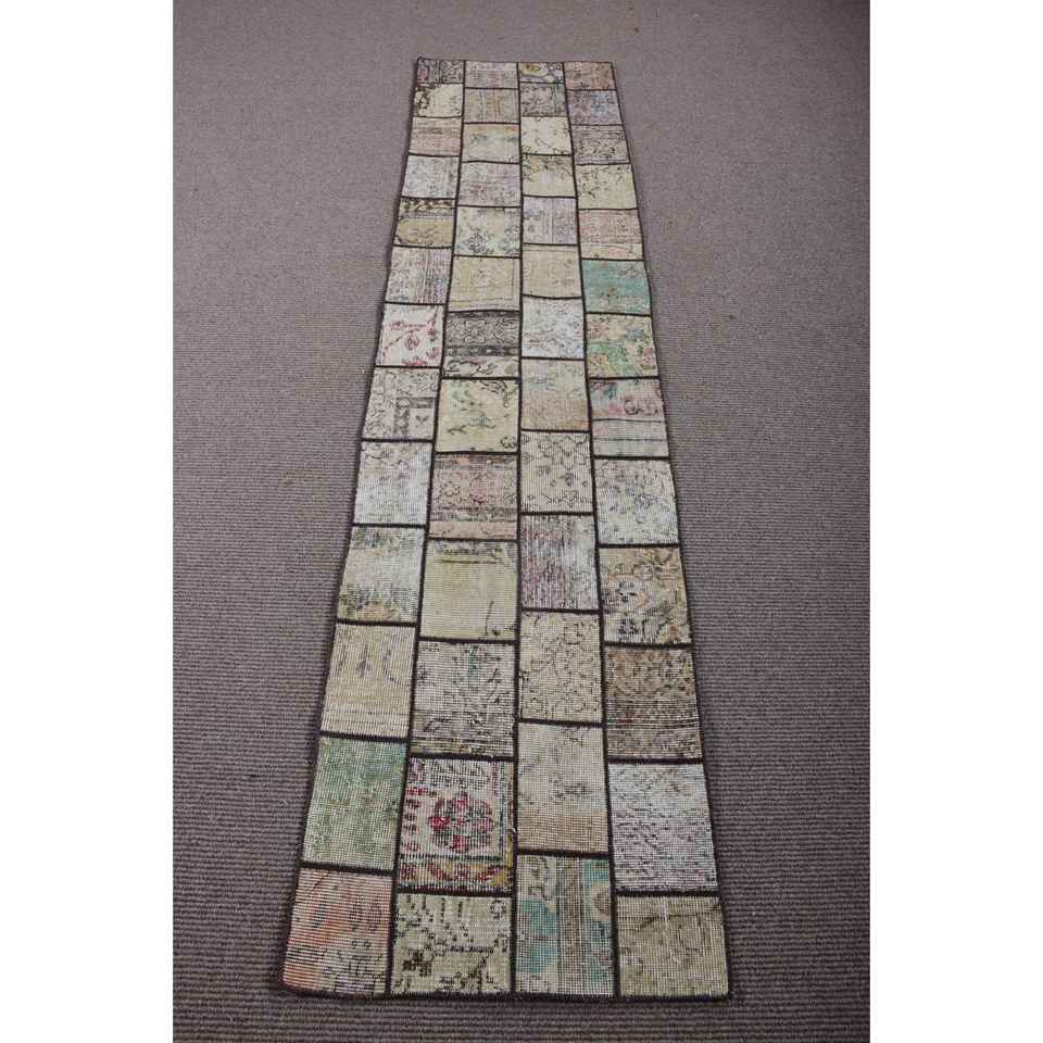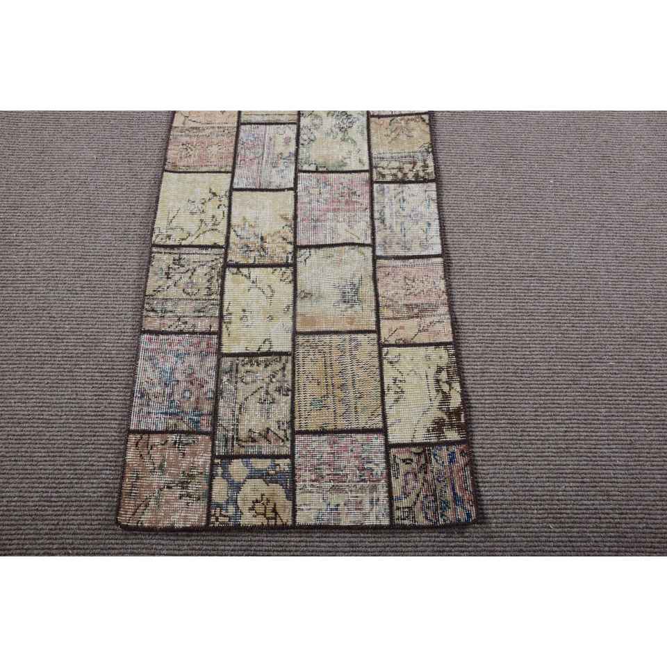Alfombra Turca Vintage de 2,1x8,5 pies, Alfombra de Lana con Diseño de Patchwork Marrón