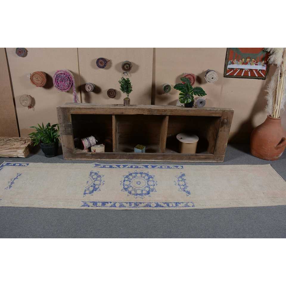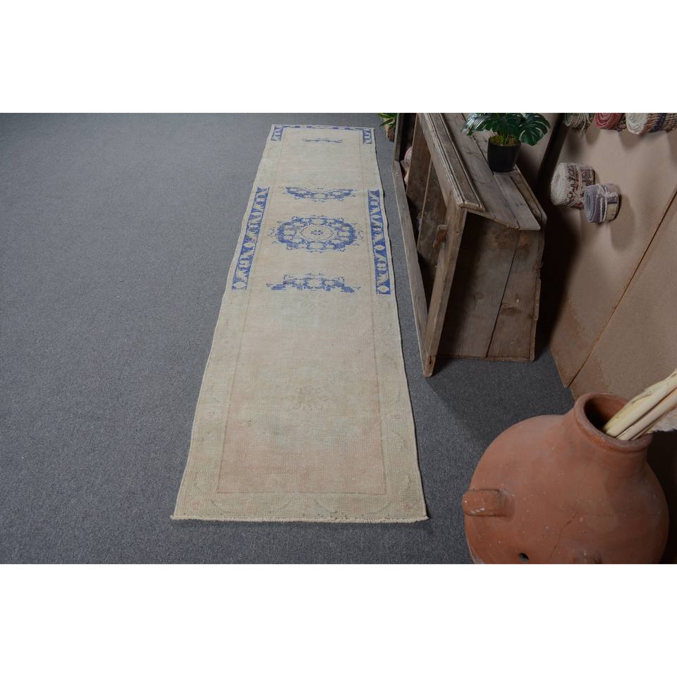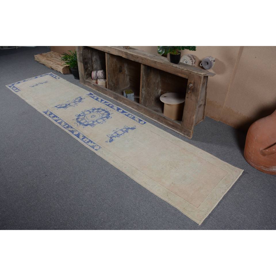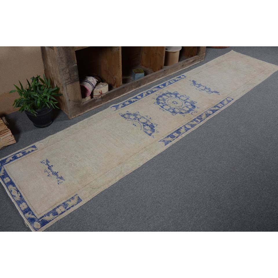 Alfombra turca Vintage de 2,3x10 pies, Beige, azul, área grande, respaldo de látex de lana, patrón abstracto para diseño de pasillo Rectangular para adolescentes
