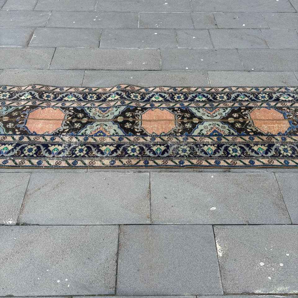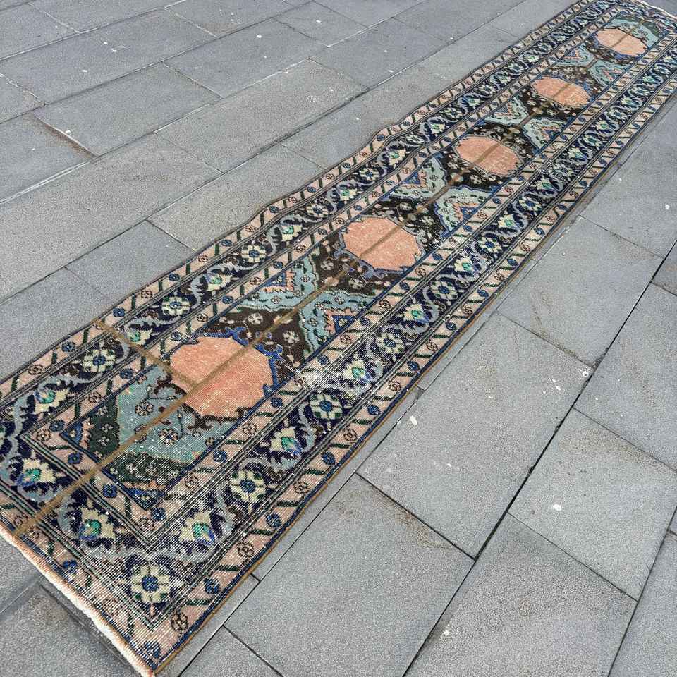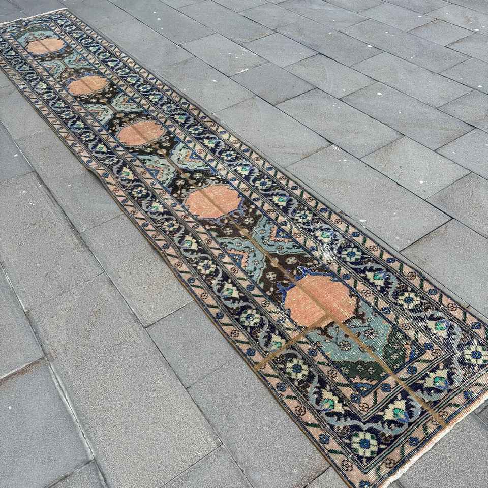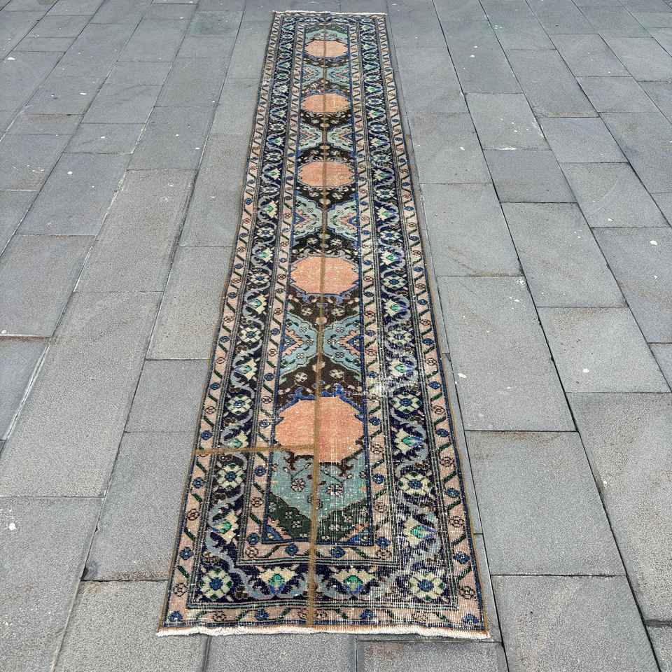 Alfombra Turca Vintage, Alfombra de 2.3x12.7 pies, Alfombra Azul con Estampado Animal