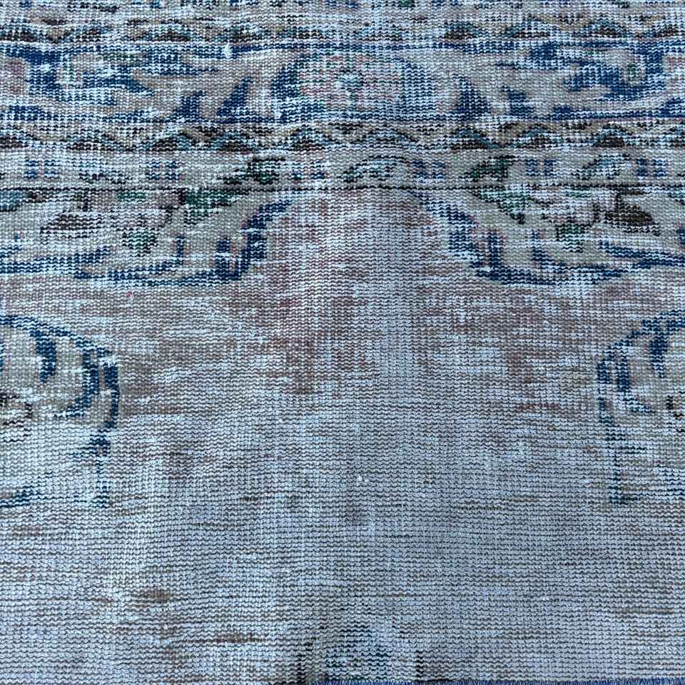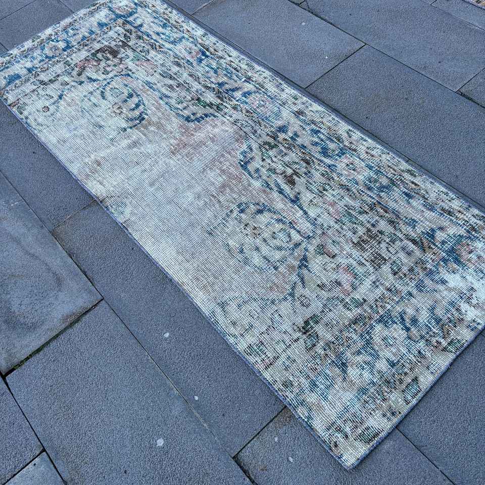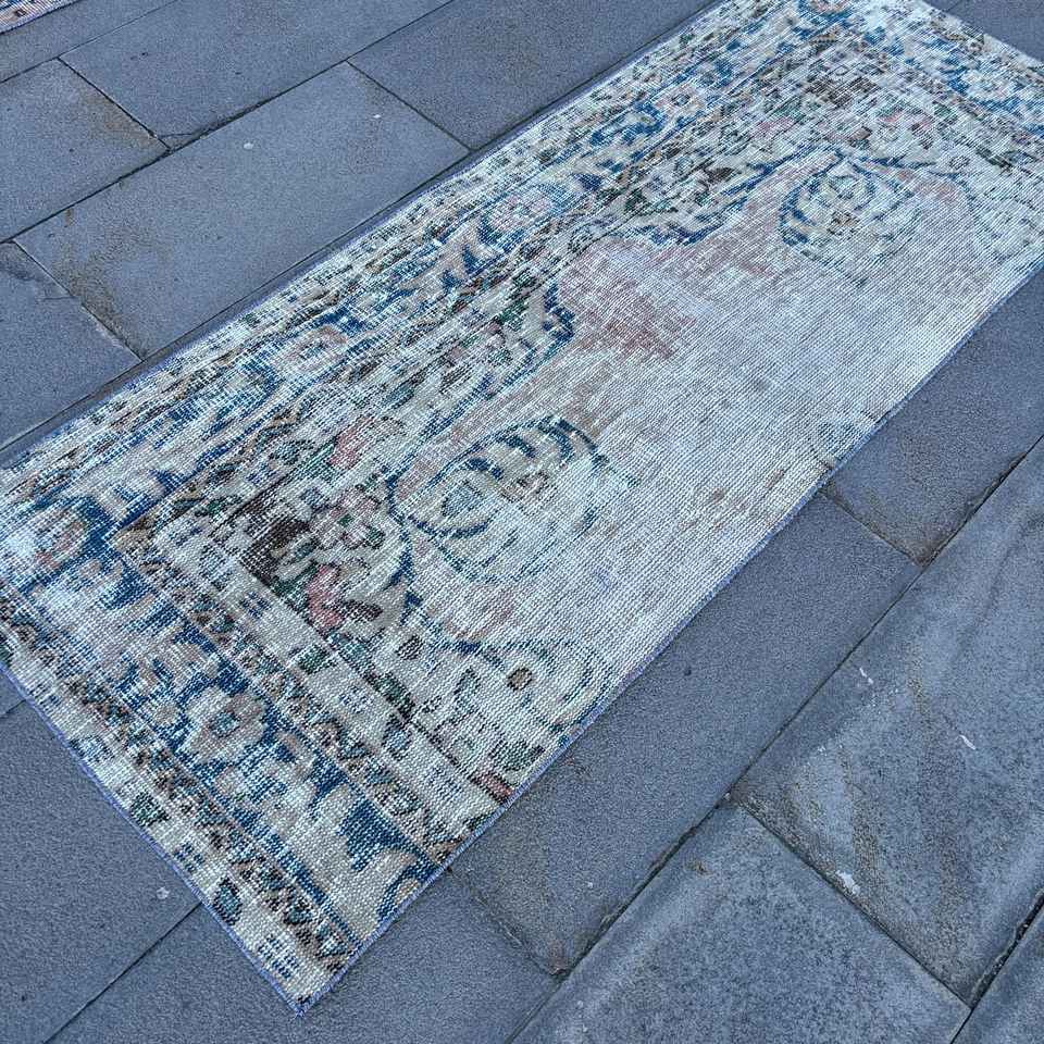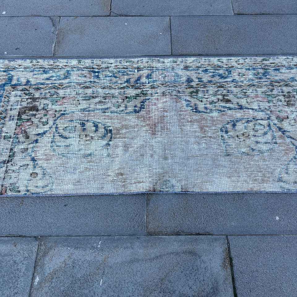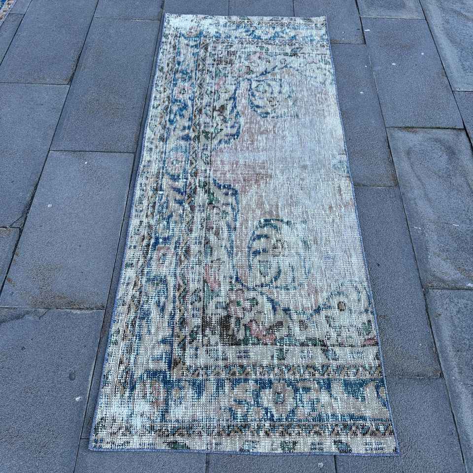 Alfombra Turca Vintage, Alfombra de Pasillo de 2.4x6 pies, Alfombra Floral Azul y Blanca