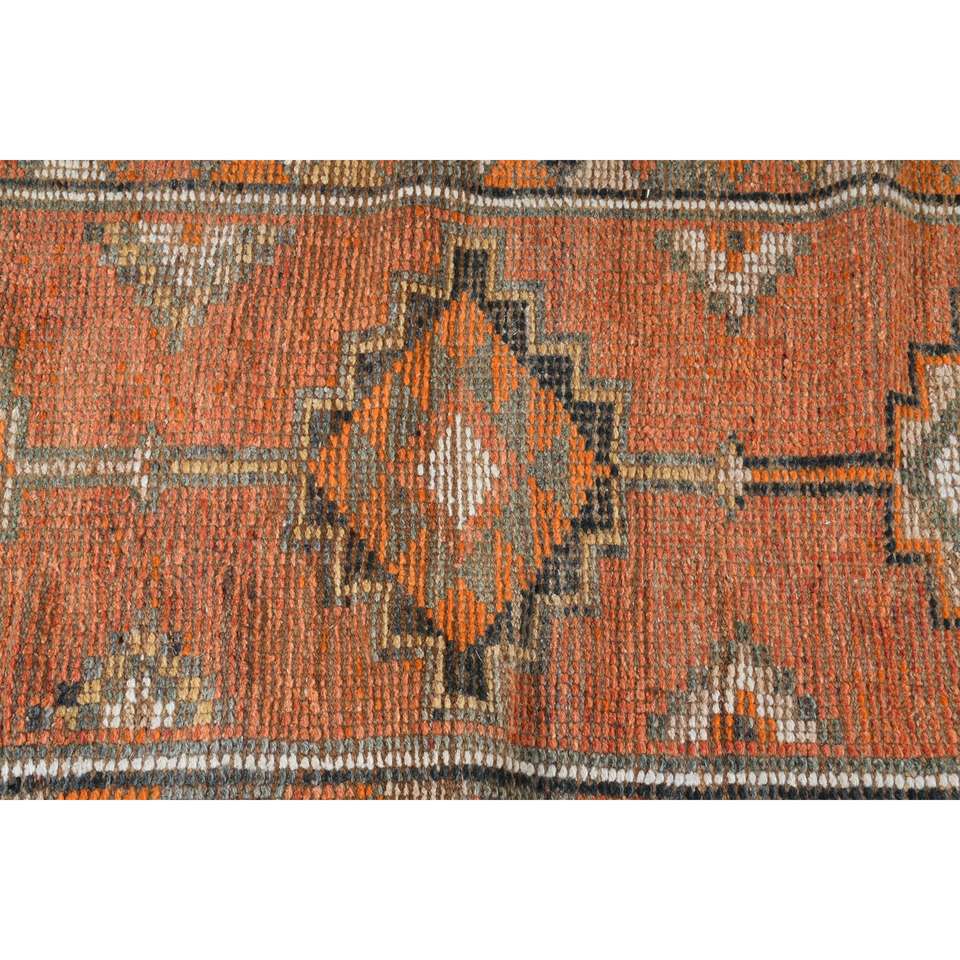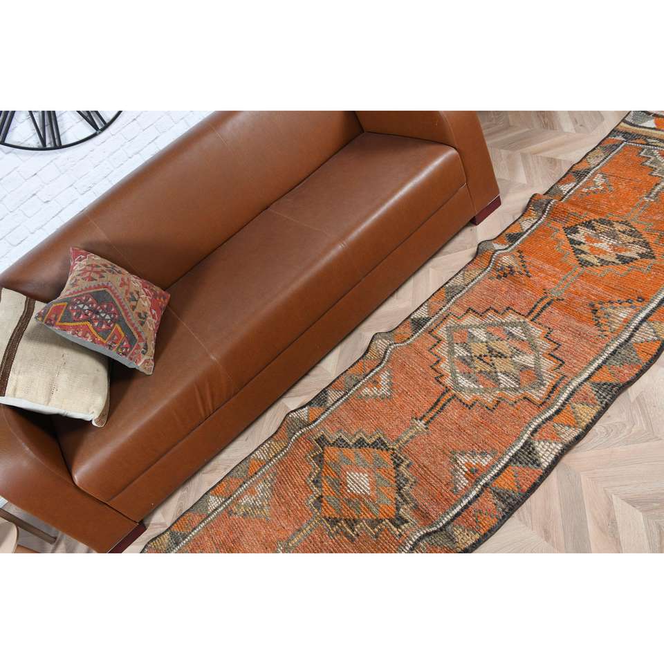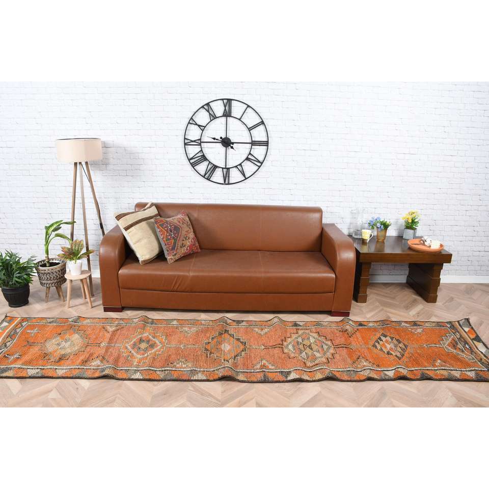 Alfombra Turca Vintage de 2.5x11.5 pies, Alfombra de Pasillo en Degradado Naranja y Gris, de Lana con Parches, Respaldo de Látex, Ecológica y Tradicional