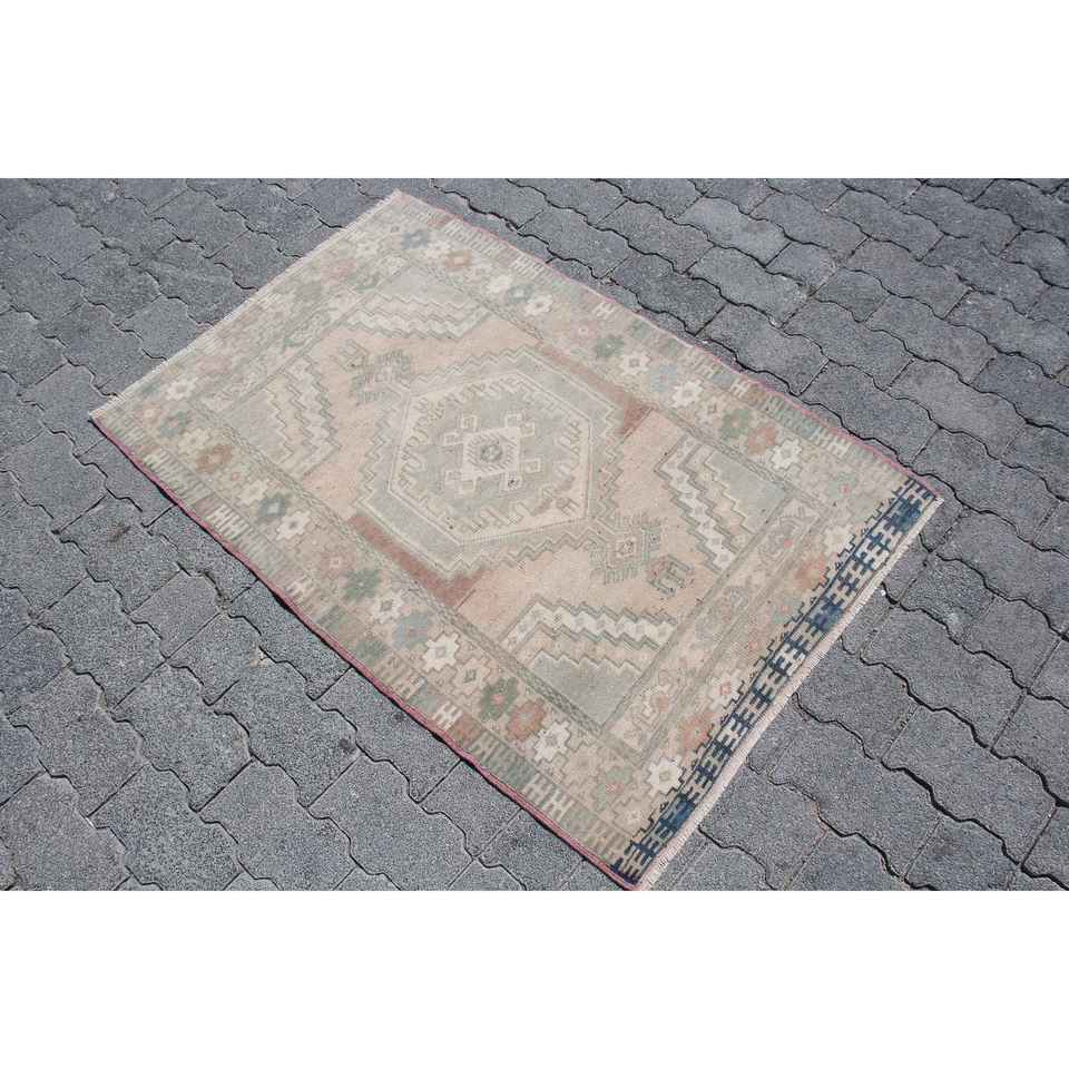 Alfombra Turca Vintage de 2.5x3.8 pies, Alfombra Azul con Puntos