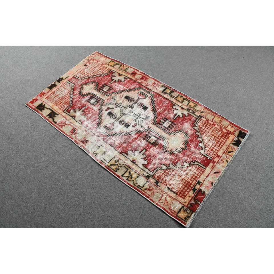 Alfombra Turca Vintage de 2.6x4.7 pies (79x142 cm), Alfombra con Borde Rojo