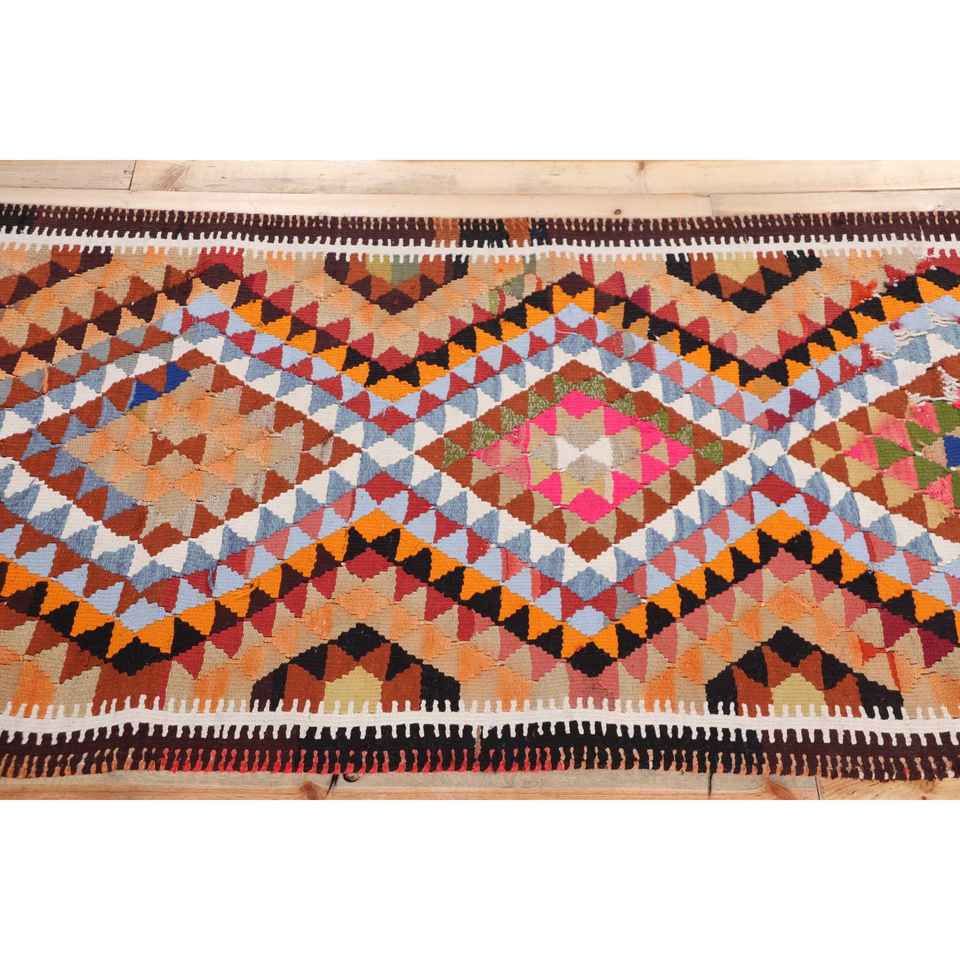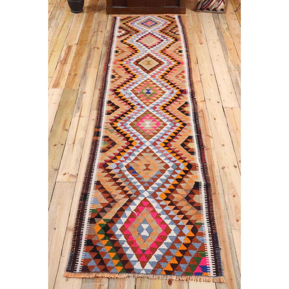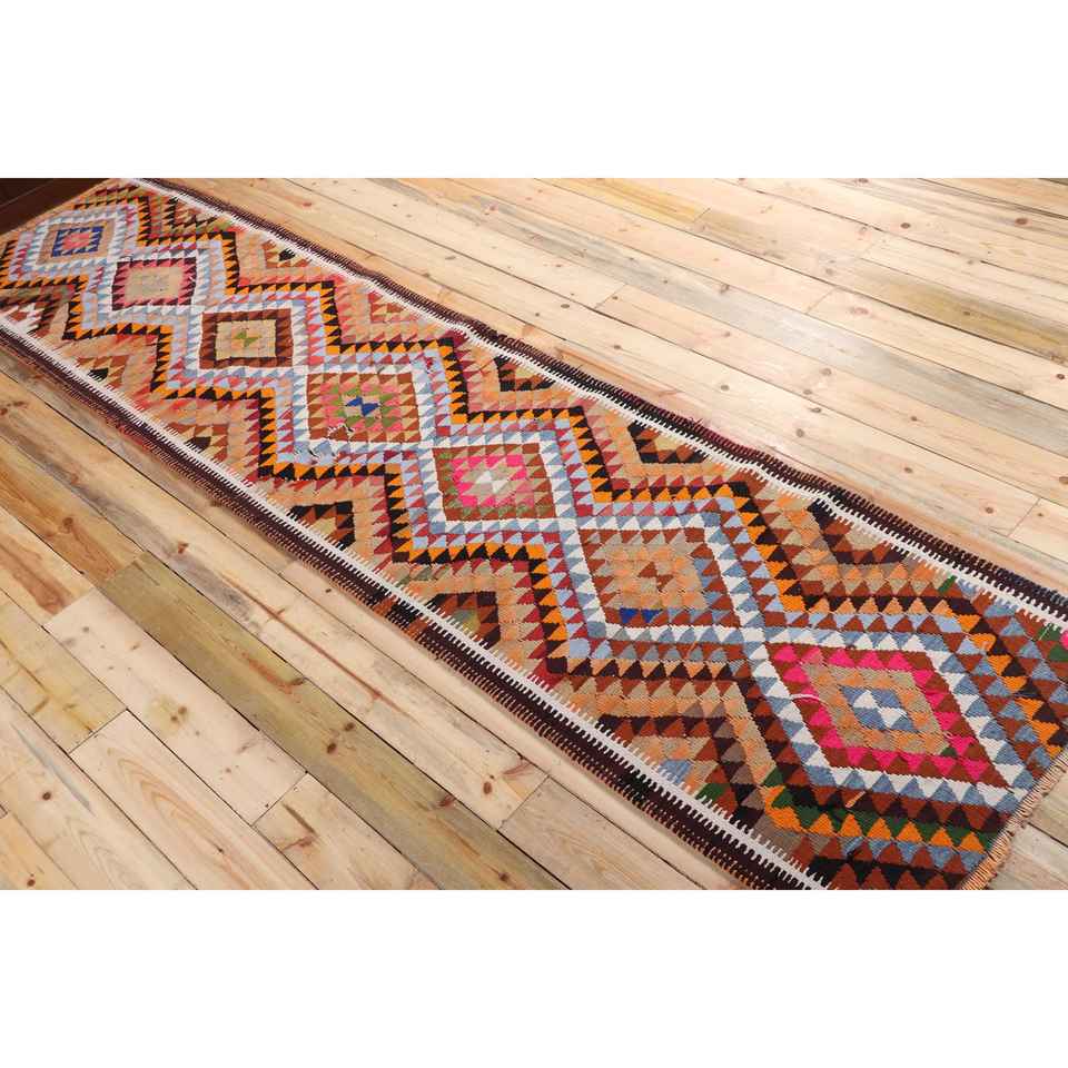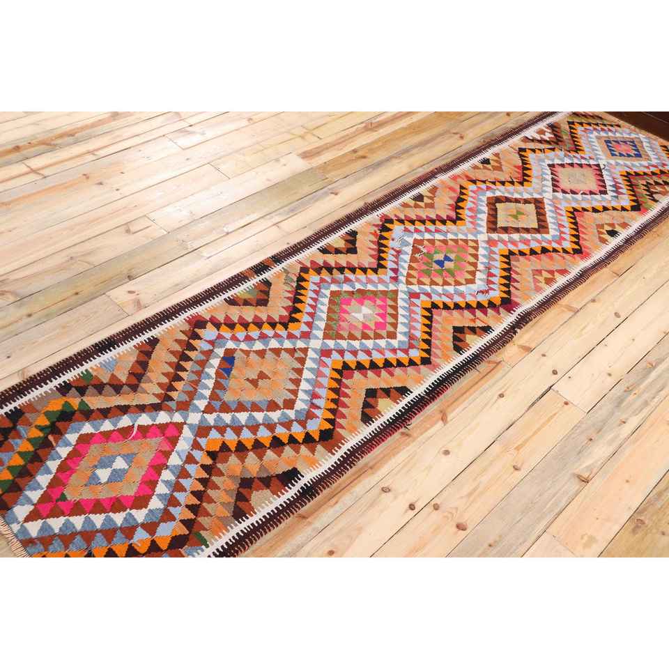 Alfombra Turca Vintage, Alfombra Kilim de 2,8x11,5 pies, Alfombra Abstracta Azul y Naranja