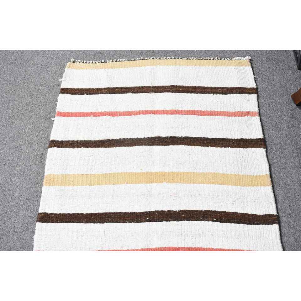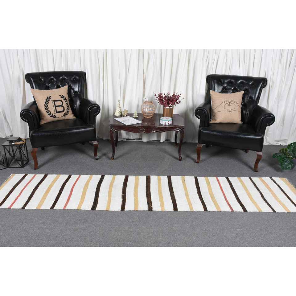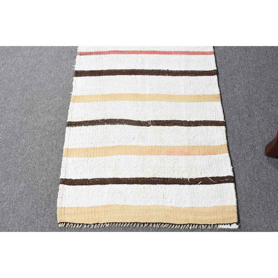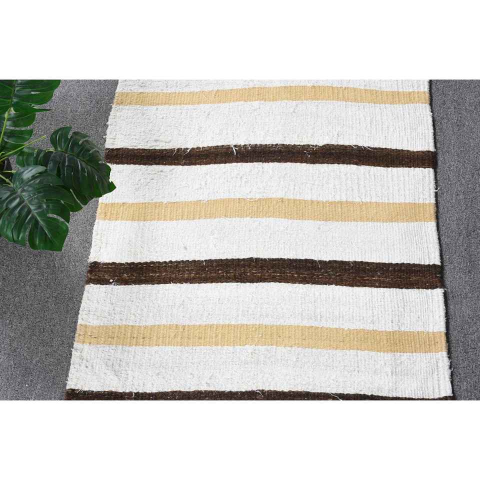 Alfombra Turca Vintage, Alfombra de Pasillo de 2x9.6 pies, Alfombra de Lana a Rayas Blancas y Marrones