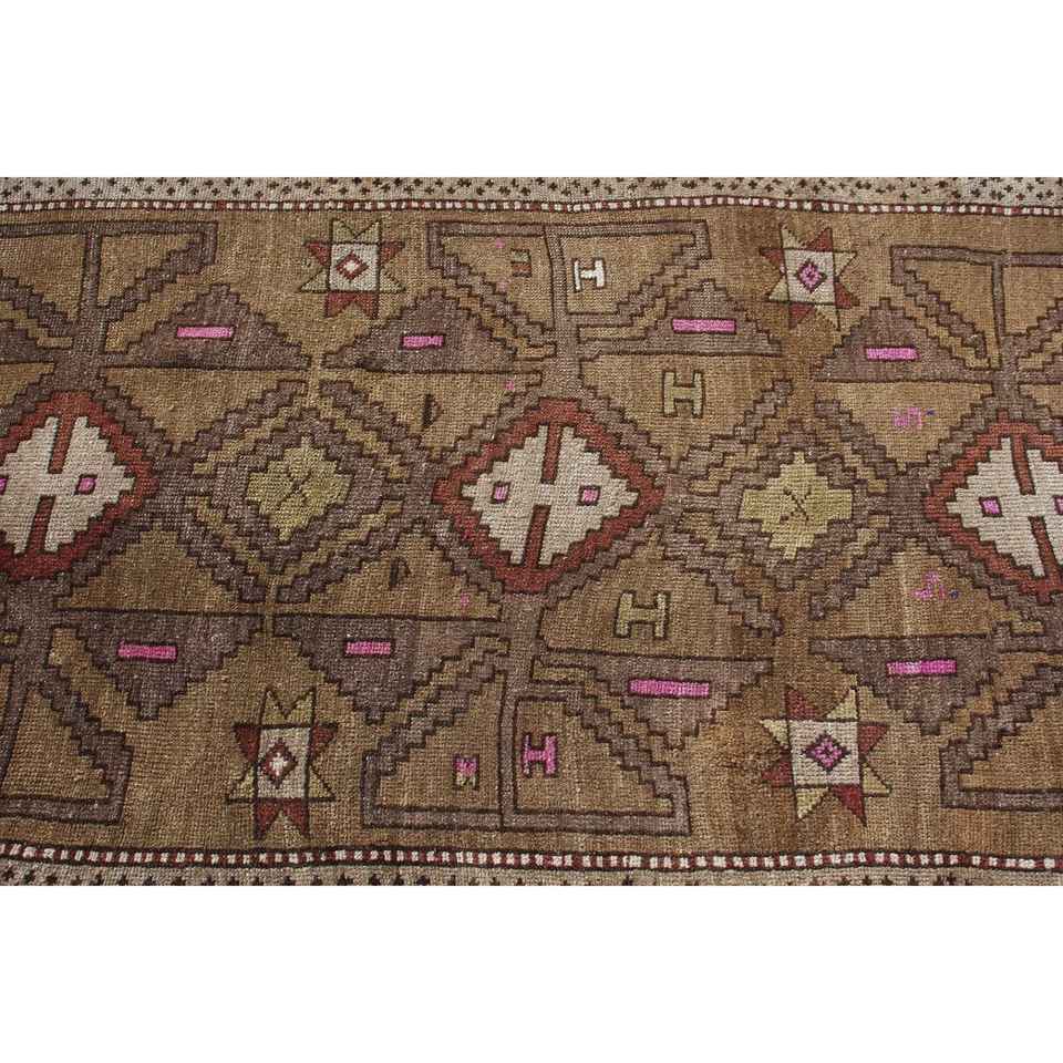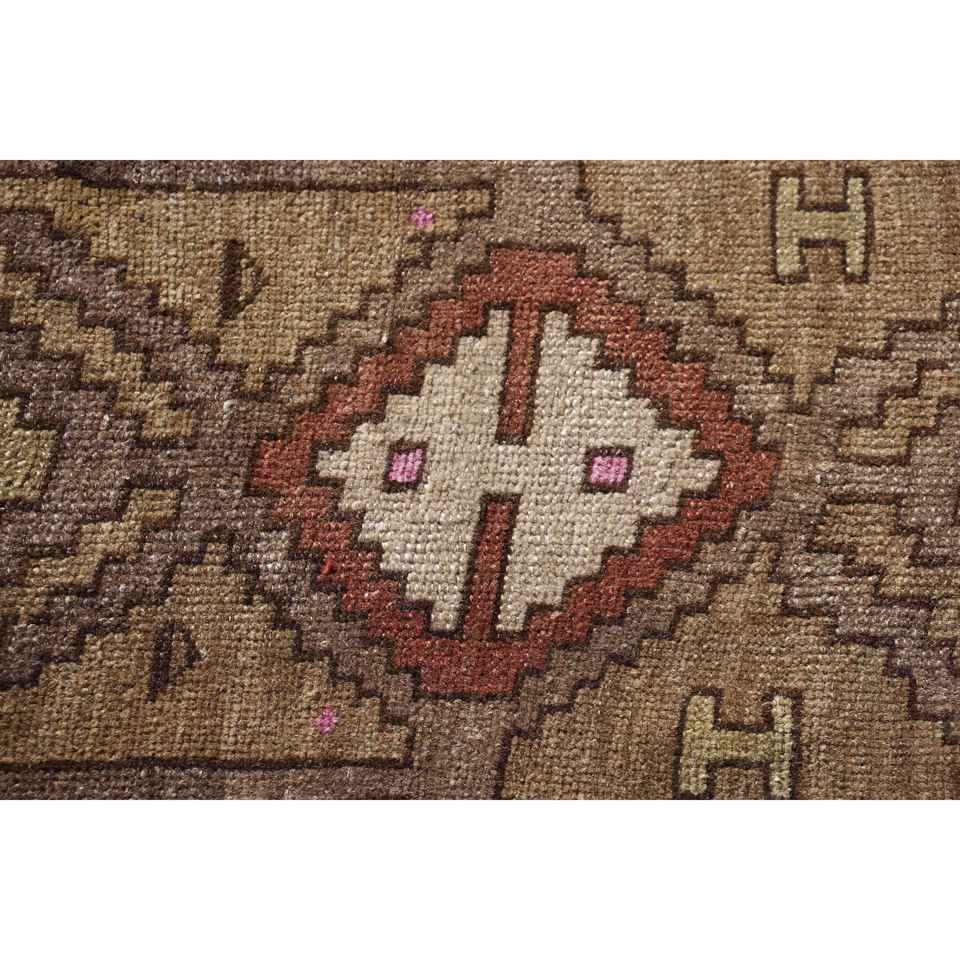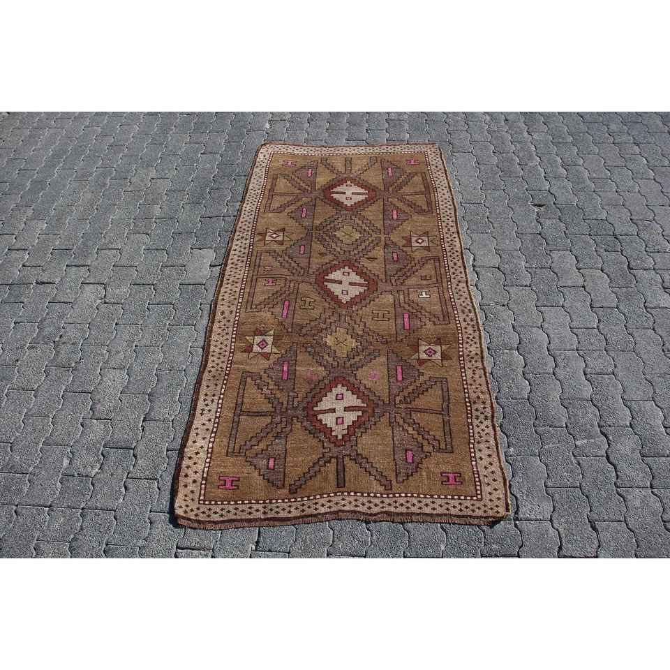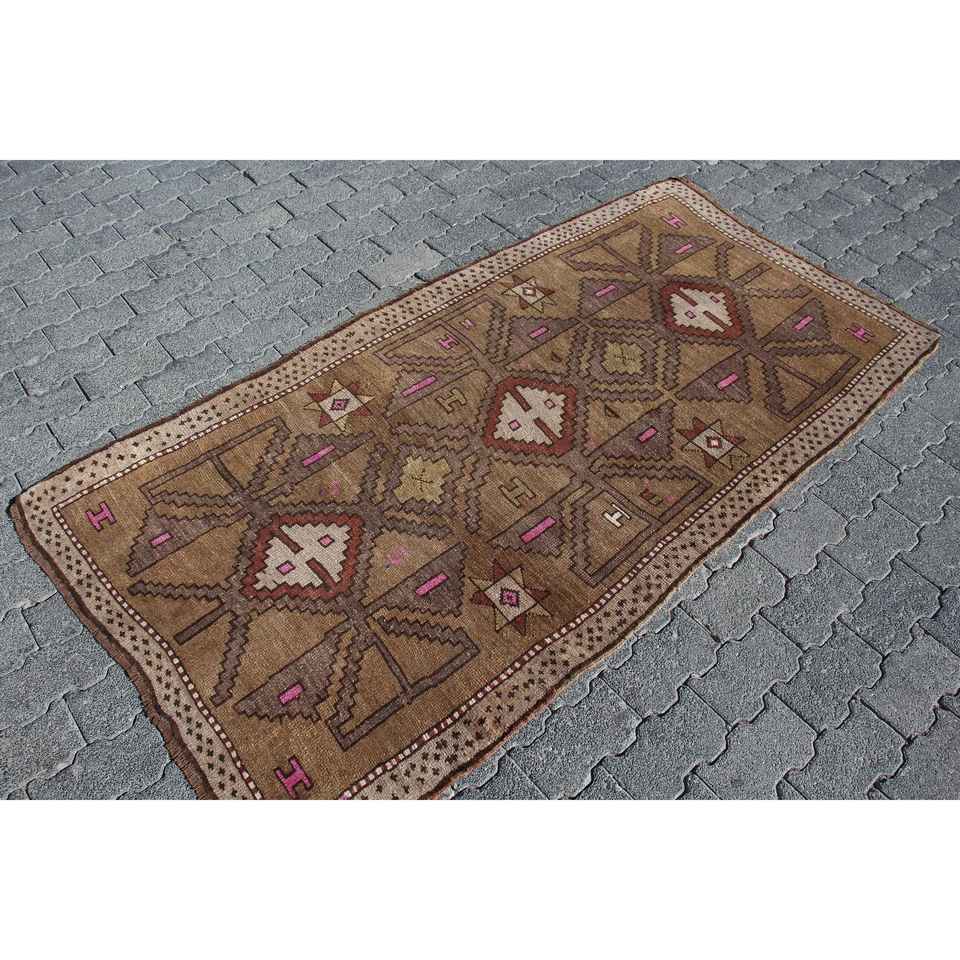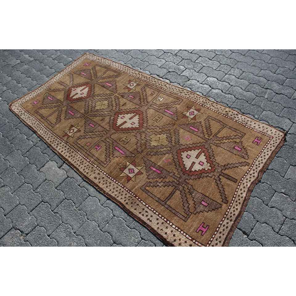 Alfombra Turca Vintage, Alfombra Decorativa de 3.2x6.4 pies, Alfombra Marroquí de Lana Marrón y Rosa
