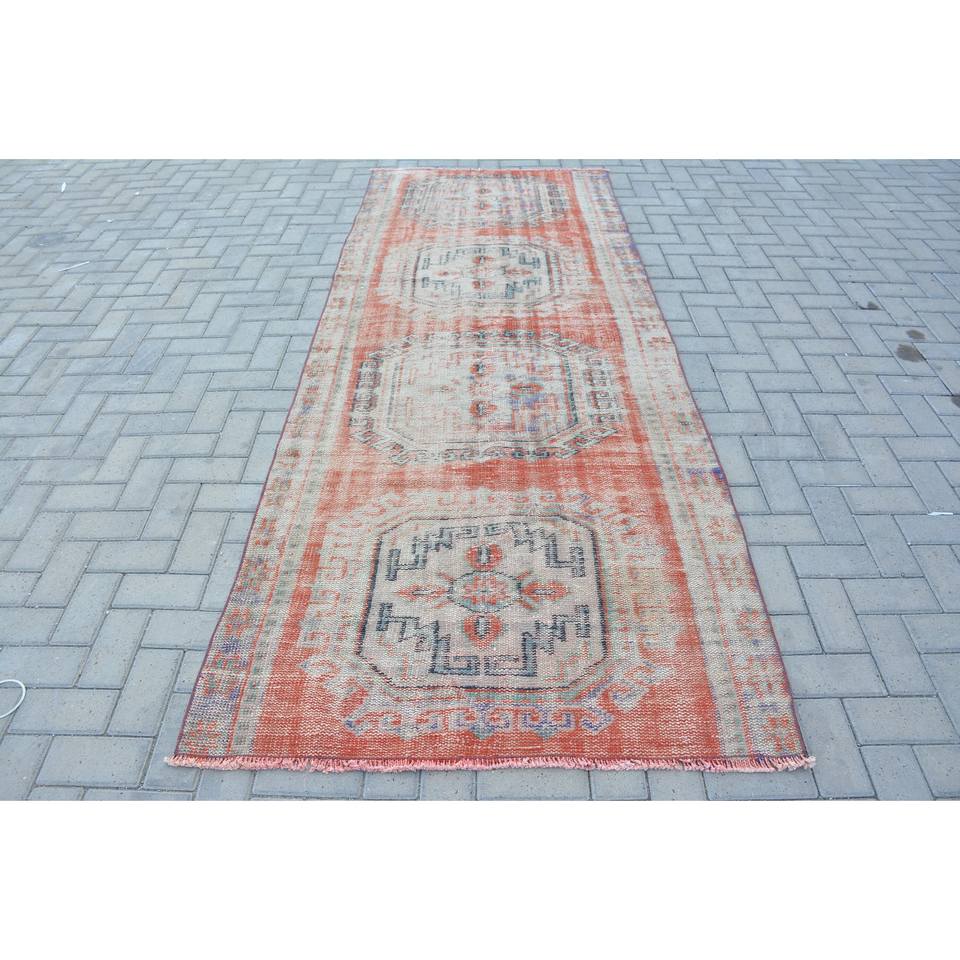 Alfombra turca vintage de 3,8x9,9 pies, naranja, beige, tejido plano de lana con patrón de retazos para decoraciones de sala de estar o uso en el pasillo