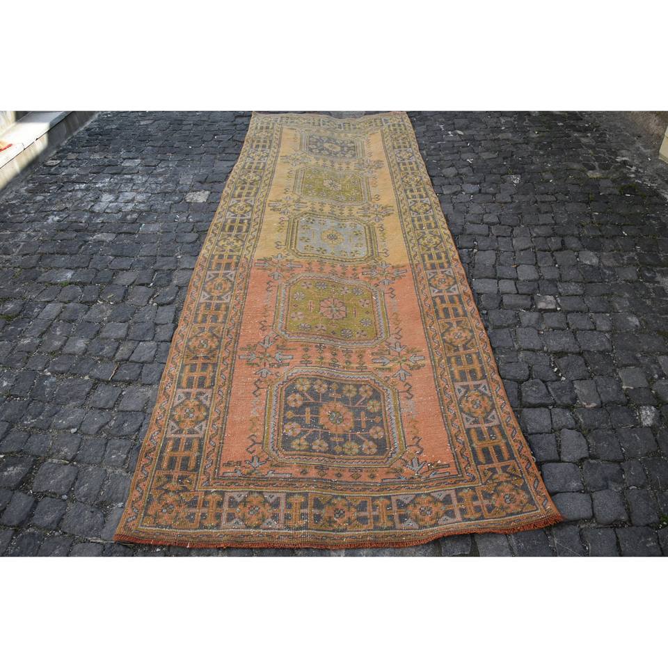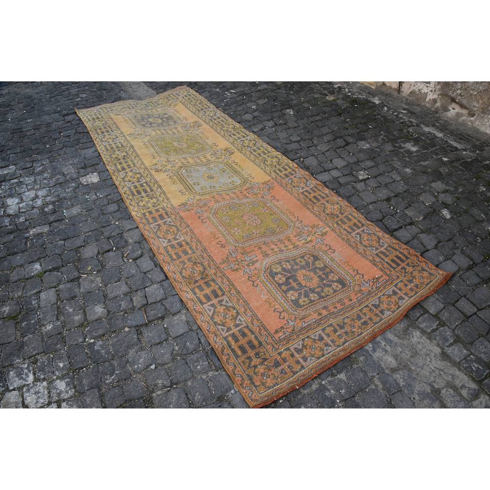 Alfombra turca vintage de 4,3x11,9 pies, diseño de retazos amarillo naranja clásico, látex de lana, área grande para pasillo, área rectangular