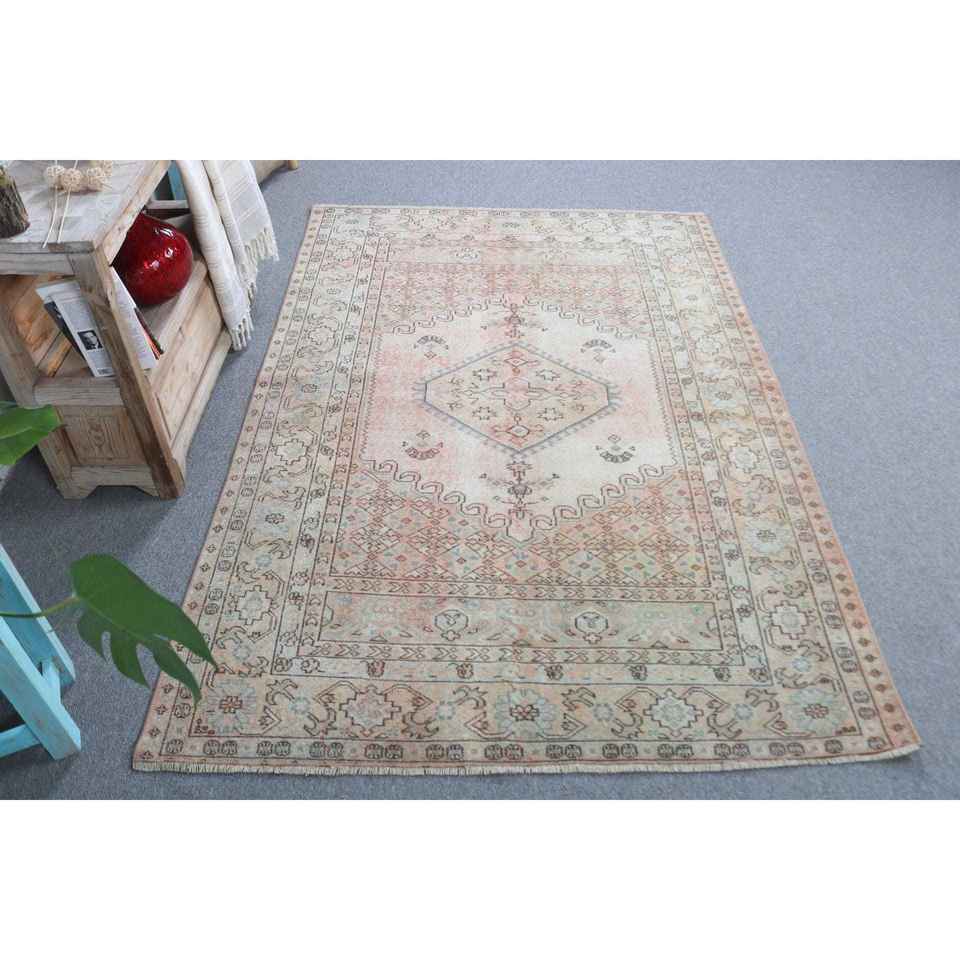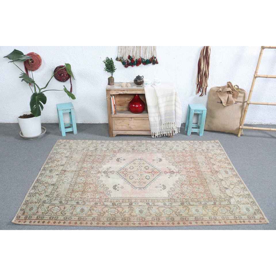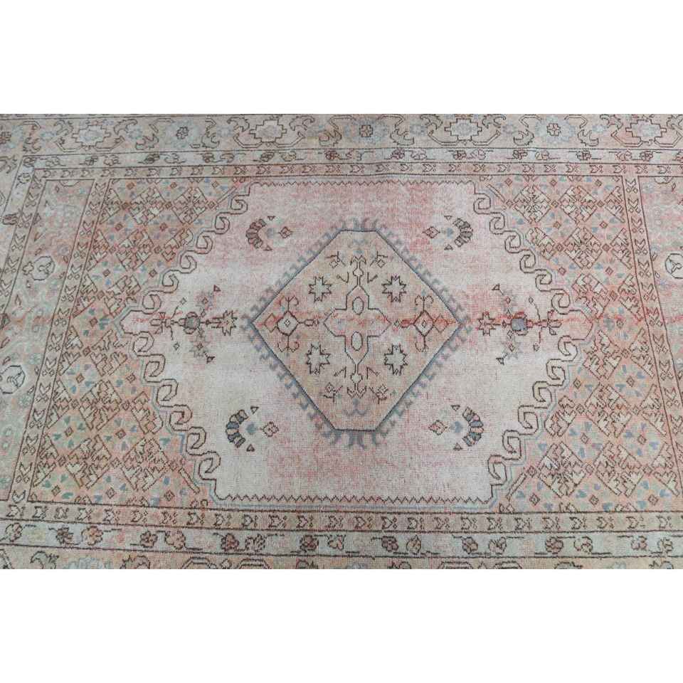 Alfombra Turca Vintage de Lana 4.3x6.3 pies, Diseño Azul Marroquí con Parches, Base de Látex Ecológica