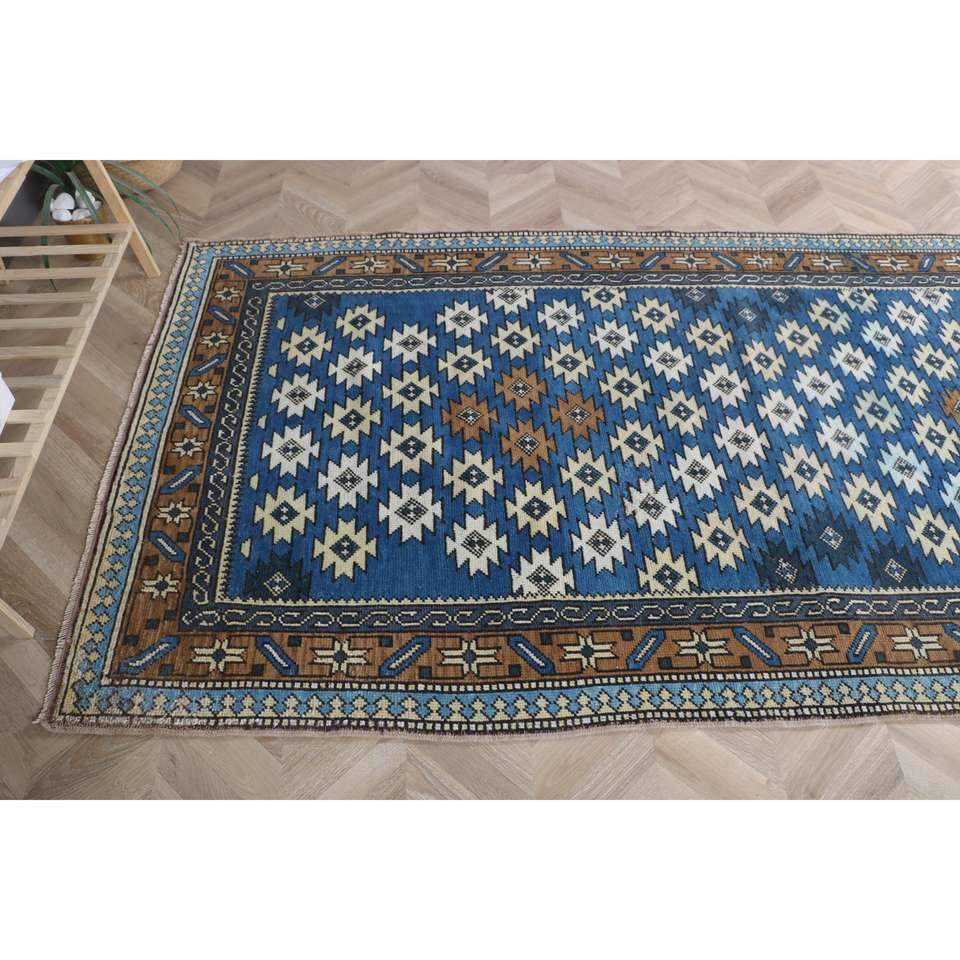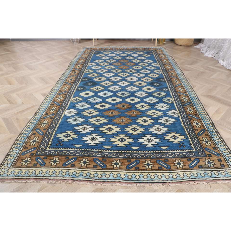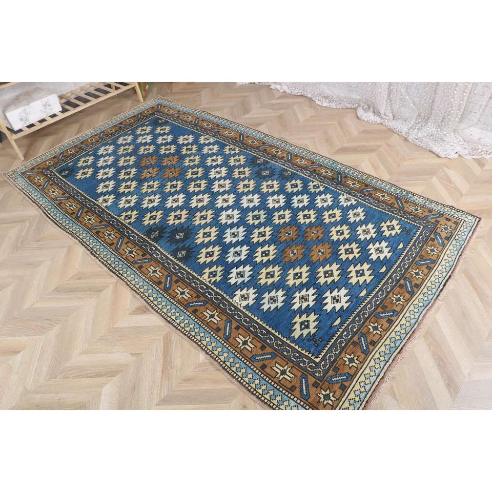 Alfombra Turca Vintage de 4.5x8.2 pies (138x249 cm), Alfombra de Lana Azul Ecológica con Parches y Base de Látex